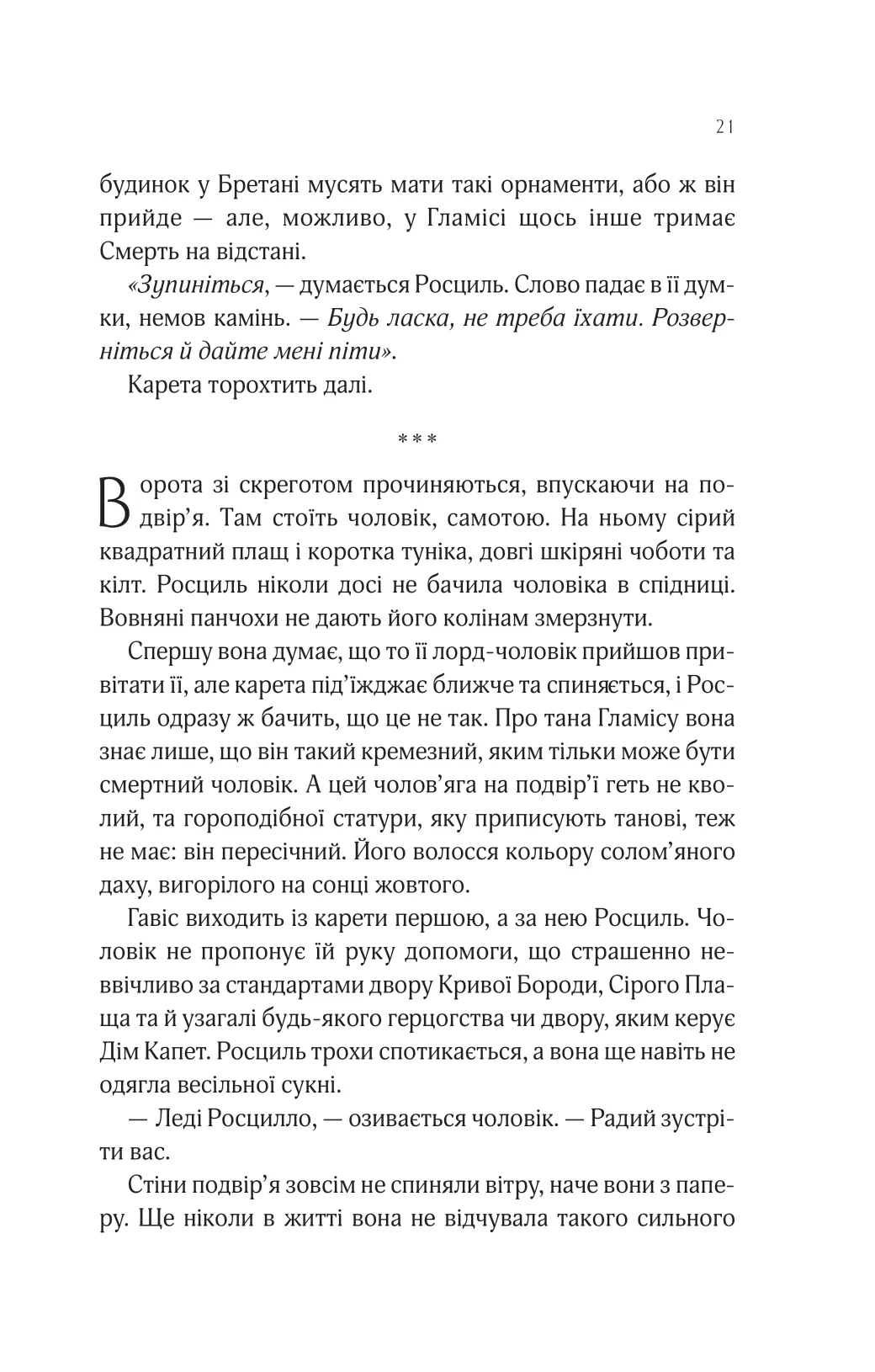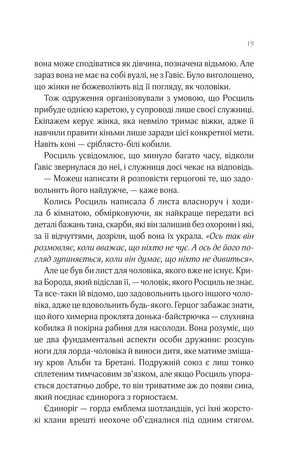 Леді знає, що її віддадуть за шотландського дикуна, який не полишає своїх воїнських звичок навіть на шлюбному ложі. Вона розуміє, що ворожий і підозріливий двір стане полем битви, де вижити можна лише завдяки хитрості та прихованому чаклунству.