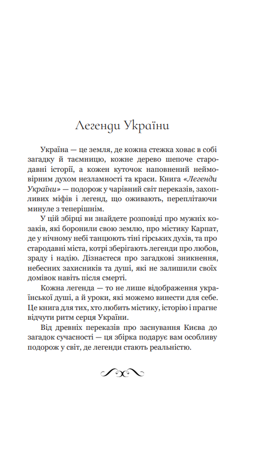Книга «Легенди України» — подорож у чарівний світ переказів, захопливих міфів і легенд, що оживають, переплітаючи минуле з теперішнім. Кожна легенда — то не лише відображення української душі, а й уроки, які можемо винести для себе. Це книга для тих, хто любить історію і прагне відчути ритм серця України.