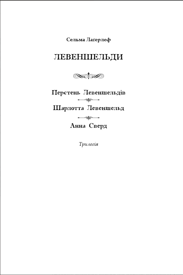 До уваги українського читача запропоновано трилогію шведської письменниці, лауреатки Нобелівської премії Сельми Лаґерлеф (1858–1940) – «Перстень Левеншельдів», «Шарлотта Левеншельд» і «Анна Сверд».