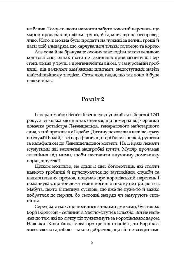 Стрижень усього цього панорамного твору – це дивовижна й загадкова історія персня, що належав генералові Левеншельду. З цією коштовністю химерно пов’язані долі членів шляхетського роду Левеншельдів і тих, хто нею тимчасово володів. Крізь усі частини трилогії червоною ниткою проходить думка про неминучу кару за скоєне зло, перемогу добра над злом і торжество любові.
