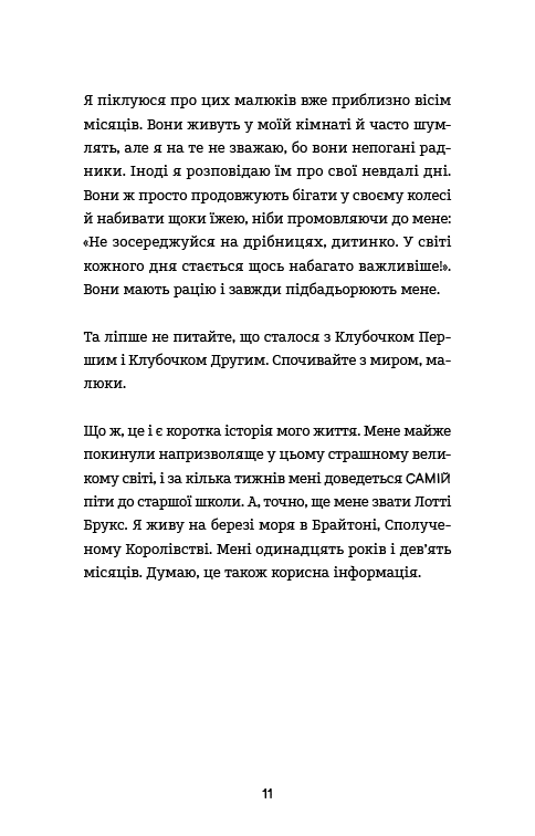 Лотті Брукс одинадцять років і дев’ять місяців, і її життя вже офіційно закінчилося — вона не тільки ось-ось піде до старшої школи без друзів та гламурного розпущеного волосся, але й щойно виявила, що має занадто плоскі груди, щоб носити БЮСТГАЛЬТЕР! Їй краще здатися і впасти в сплячку зі своїми хом’яками Професором Барнабі Пискунцем та Клубочком Третім.