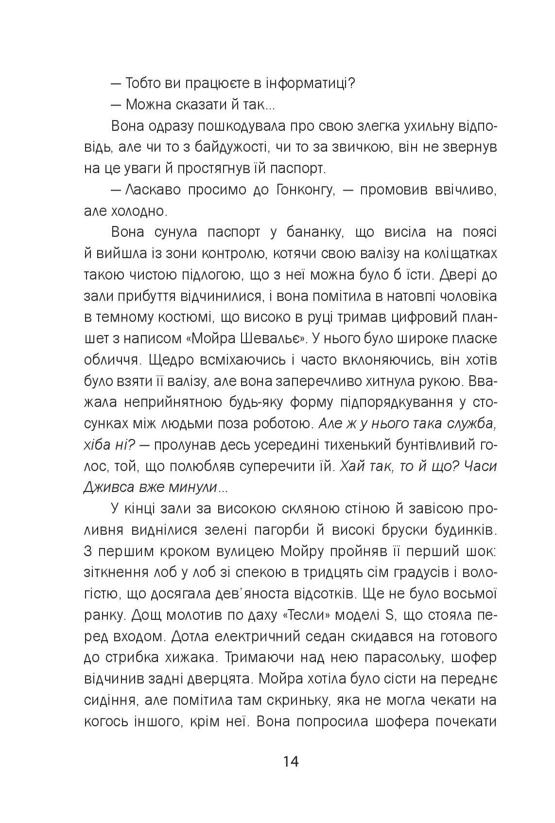 Мойру Шевальє, молоду француженку, запросили на роботу в китайську транснаціональну компанію високих технологій "Мін", розташовану в Гонконгу. Вона має взяти участь у створенні чатбота – програми штучного інтелекту, яка не тільки надаватиме користувачам правильні відповіді на всі запитання, а й упереджуватиме їхні бажання. Зрозуміло, така інновація визначатиме майбутнє гігантів всесвітнього павутиння: той, хто зможе створити кращу програму, диктуватиме стандарти життя на планеті. Робота захоплива, проте оповита численними таємницями, на сторожі яких стоїть потужна охоронна служба дослідницького центру. Не набагато спокійніше життя й у самому Гонконгу, де з рідкісним садизмом лютує серійний убивця, вкорочуючи віку молодим жінкам. Усі жертви мають дещо спільне: свого часу працювали в компанії "Мін"... Мойру Шевальє, молоду француженку, запросили на роботу в китайську транснаціональну компанію високих технологій "Мін", розташовану в Гонконгу. Вона має взяти участь у створенні чатбота – програми штучного інтелекту, яка не тільки надаватиме користувачам правильні відповіді на всі запитання, а й упереджуватиме їхні бажання. Зрозуміло, така інновація визначатиме майбутнє гігантів всесвітнього павутиння: той, хто зможе створити кращу програму, диктуватиме стандарти життя на планеті. Робота захоплива, проте оповита численними таємницями, на сторожі яких стоїть потужна охоронна служба дослідницького центру. Не набагато спокійніше життя й у самому Гонконгу, де з рідкісним садизмом лютує серійний убивця, вкорочуючи віку молодим жінкам. Усі жертви мають дещо спільне: свого часу працювали в компанії "Мін"...