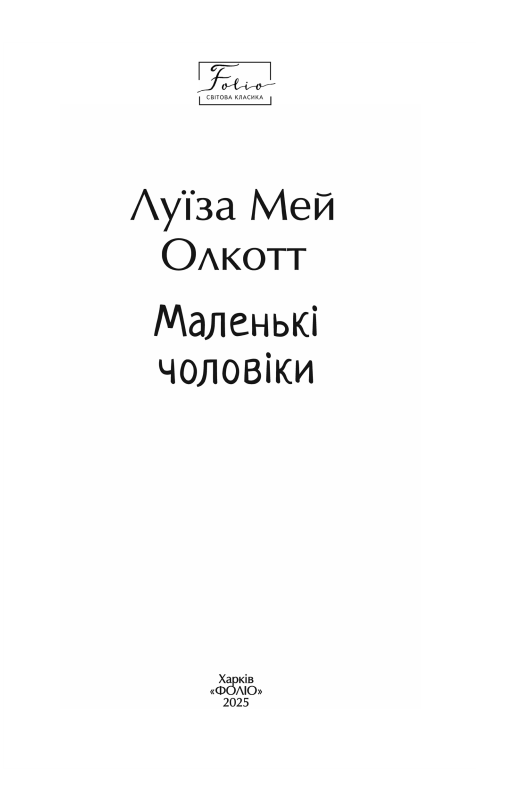 У романі «Маленькі чоловіки» Луїза Мей Олкотт розповідає про незвичну школу в старовинному маєтку, де немає строгих правил і чіткого розпорядку, та й програма не вимагає засвоїти якомога більше предметів. Хлопчики, різні за віком і характерами, шибайголови й зовсім безпомічні, розпещені надмірною батьківською увагою й колишні безпритульні, навчаються цінувати дружбу та покликання, порядність і співчуття. Непрості випробування роблять їх справжніми чоловіками. Адже не вік визначає це поняття.