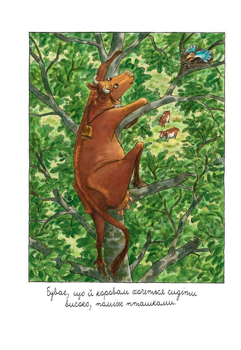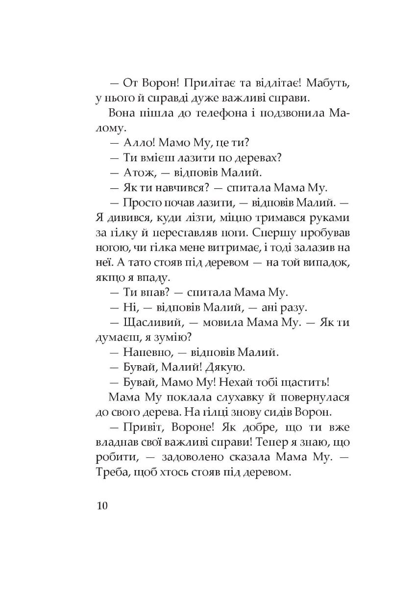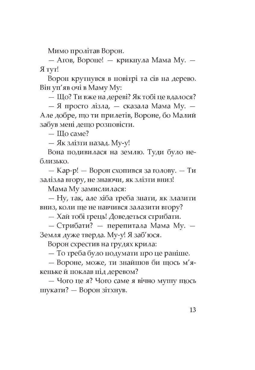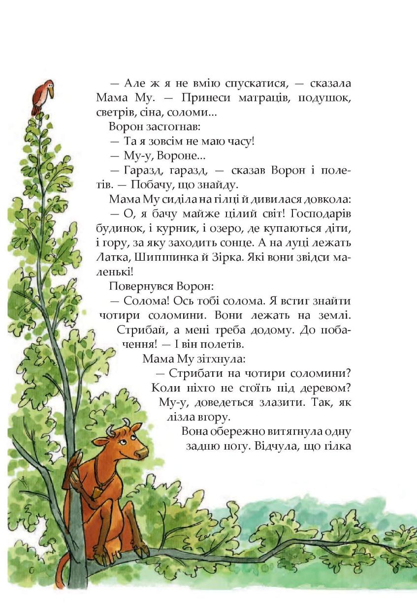 — Я все-таки полізу на дерево. Корови туди ніколи не лазять. А я полізу. Вона підвелася і схопилася передньою ногою за найнижчу гілку. Тоді потягнулася до наступної. — О! Ця, певно, витримає. Добре, що вона так низько. Мама Му міцно трималася передніми ногами і придивлялася, куди ступати далі. Під нею трохи хрускало. Листя й маленькі гілочки лоскотали їй морду. Мало-помалу, гілка за гілкою вона забиралася все вище й вище. І нарешті вже майже досягла верхівки. — Ну от і вилізла! — засопіла вона й сіла на гілку. Ворон крутнувся в повітрі та сів на дерево. Він уп’яв очі в Маму Му: — Що? Ти вже на дереві? Як тобі це вдалося? — Я просто лізла, — сказала Мама Му. — Але добре, що ти прилетів, Вороне, бо Малий забув мені дещо розповісти. — Що саме? — Як злізти назад. Му-у!