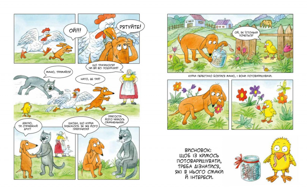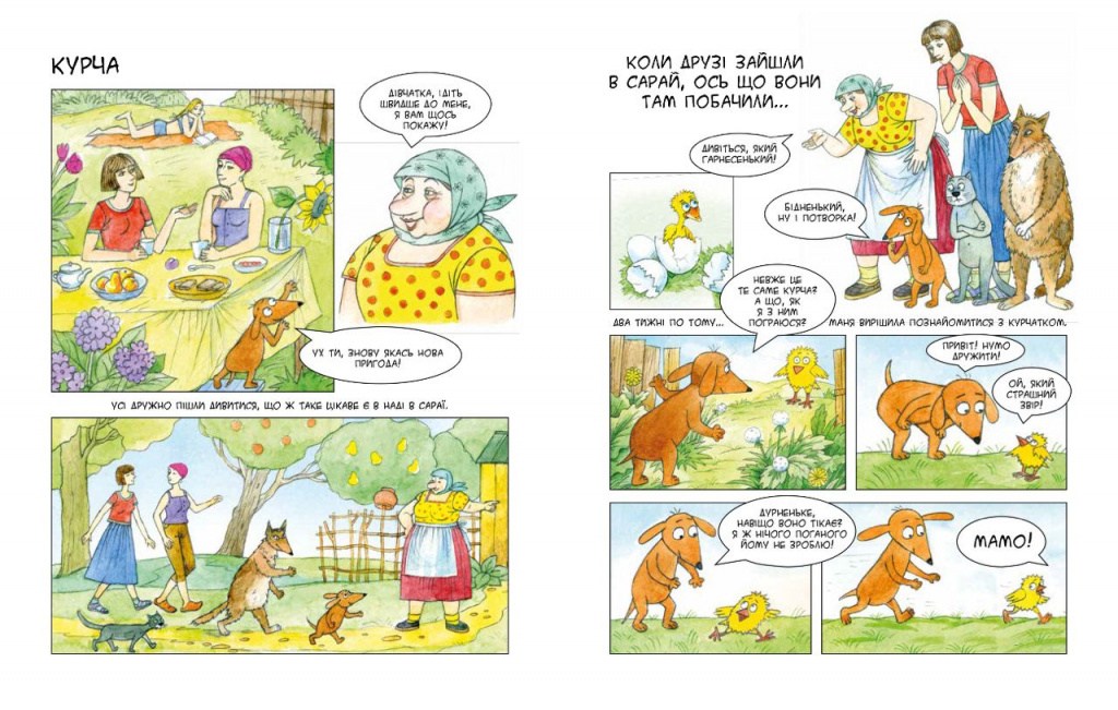 Там стільки всього цікавого! Кози, корови, гуси, кури, свині, коні! А ще всіляка дрібнота: їжачки, ящірки, бабки, равлики, метелики й жуки! Я розповім вам про ліс, ягоди й гриби.