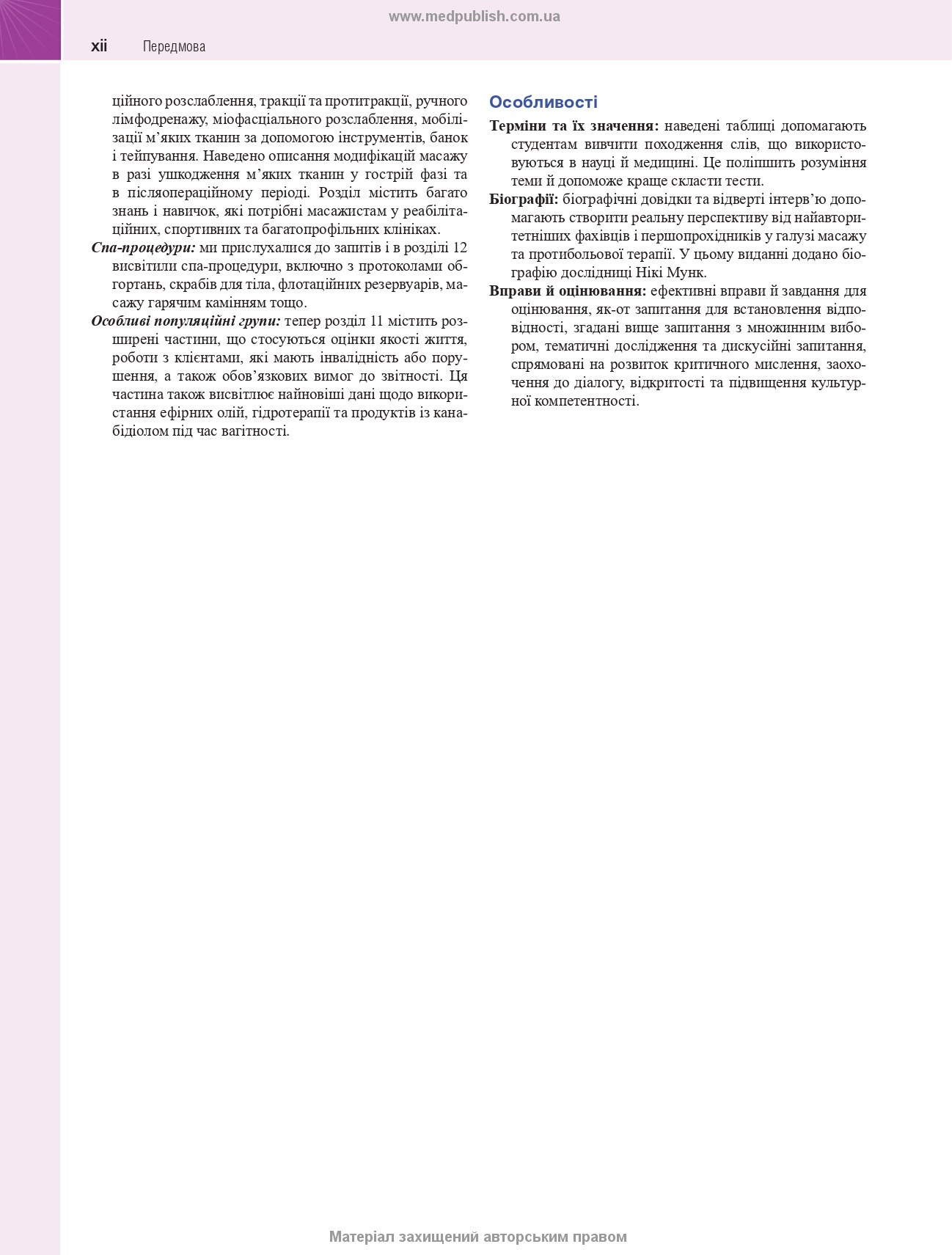 • УНІКАЛЬНО! Завдяки поєднанню матеріалів з анатомії, фізіології та основ масажу видання надзвичайно зручне: ви купуєте лише одну книгу, не носите з собою стоси посібників.
