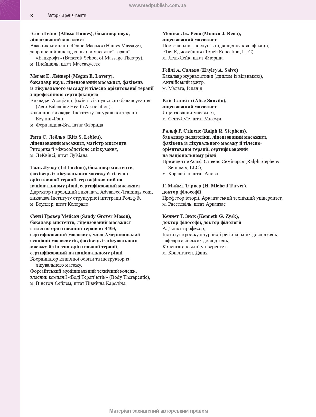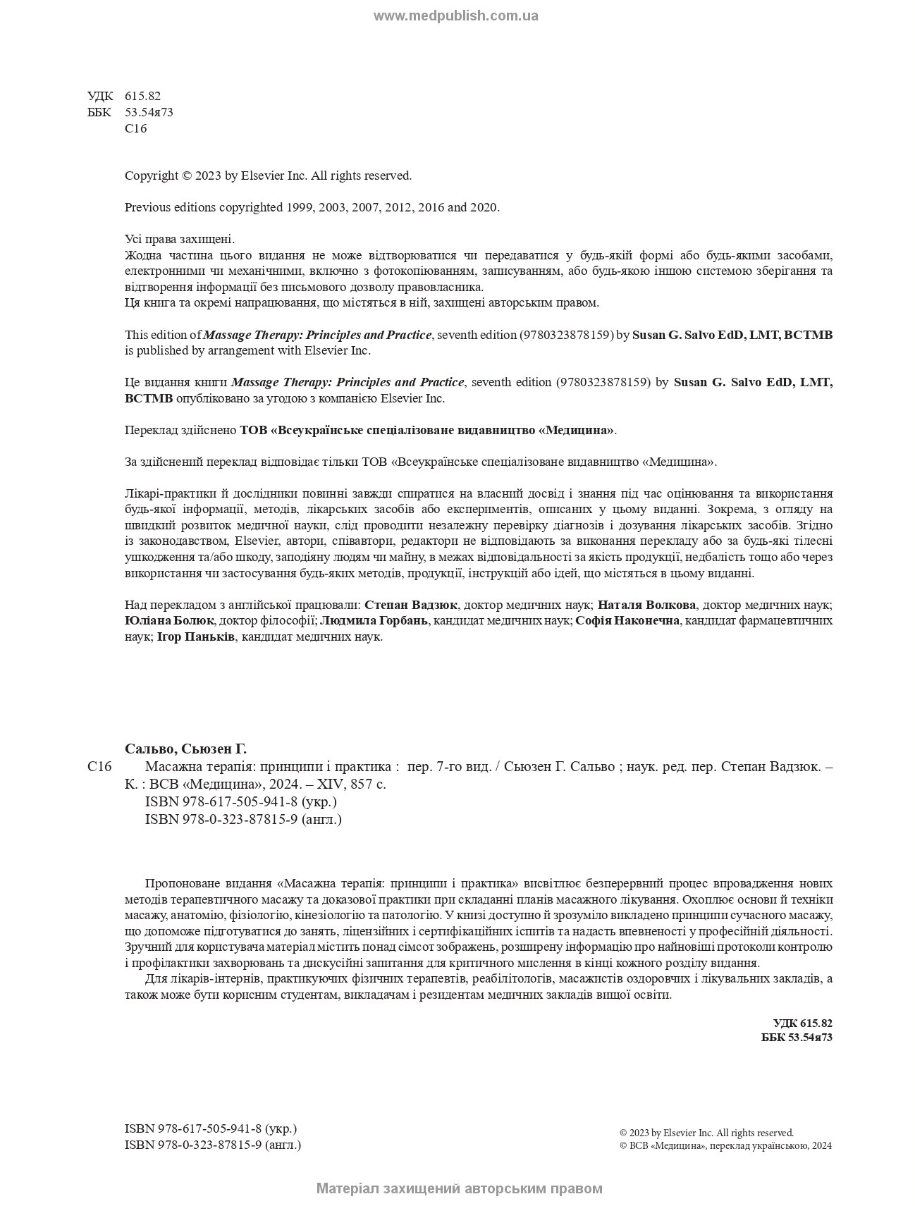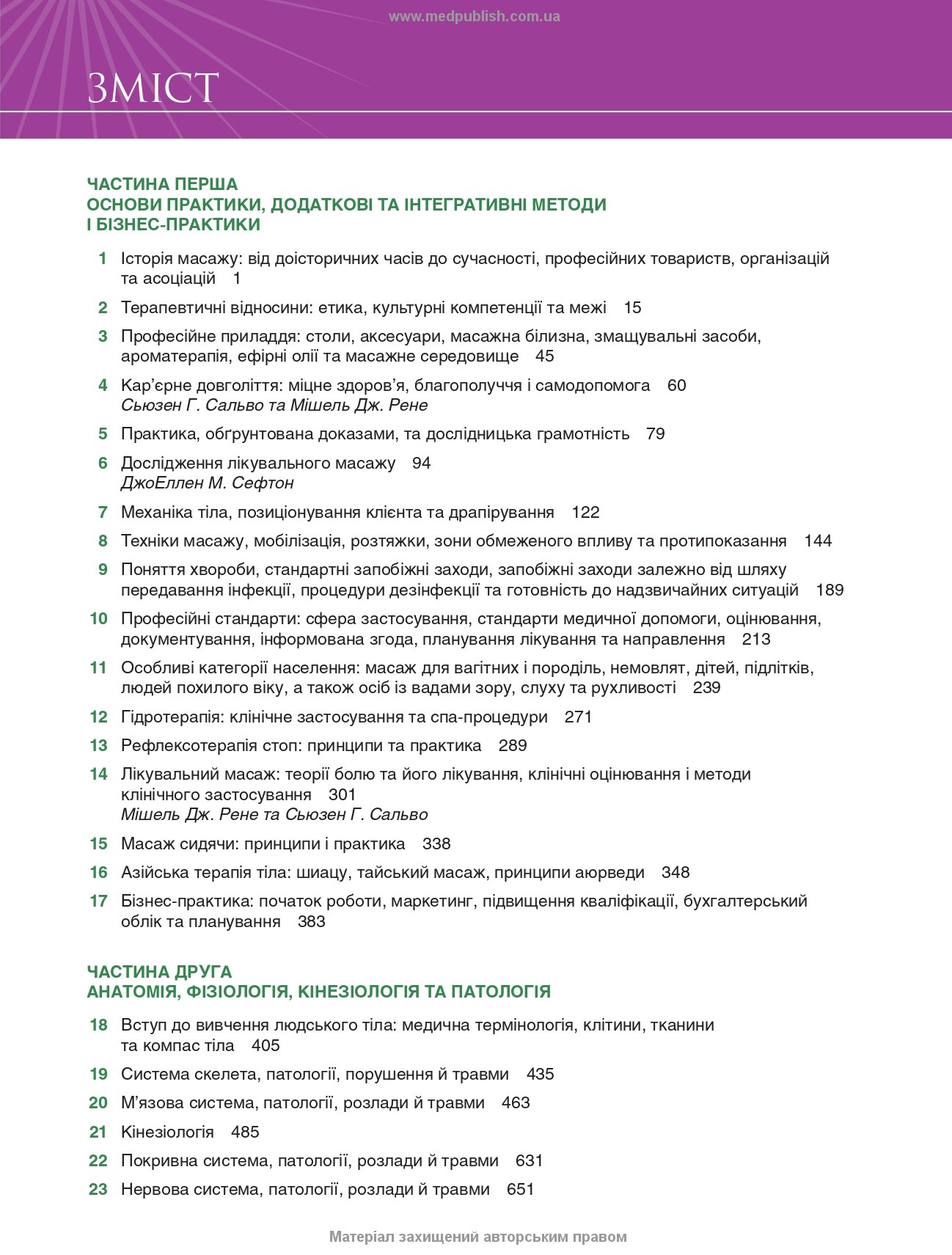 Книга призначена для лікарів-інтернів, практикуючих фізичних терапевтів, реабілітологів, масажистів оздоровчих і лікувальних закладів, а також може бути корисною студентам, викладачам і резидентам медичних закладів вищої освіти.