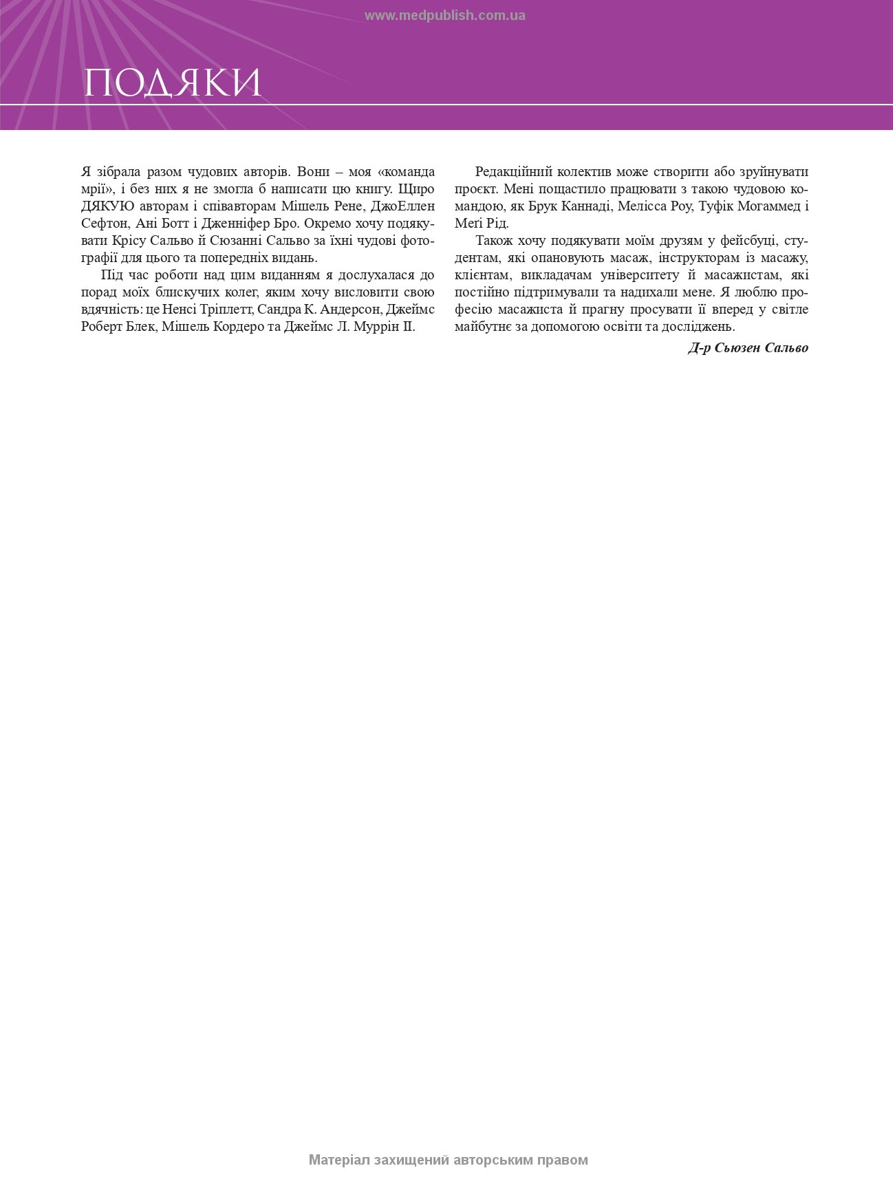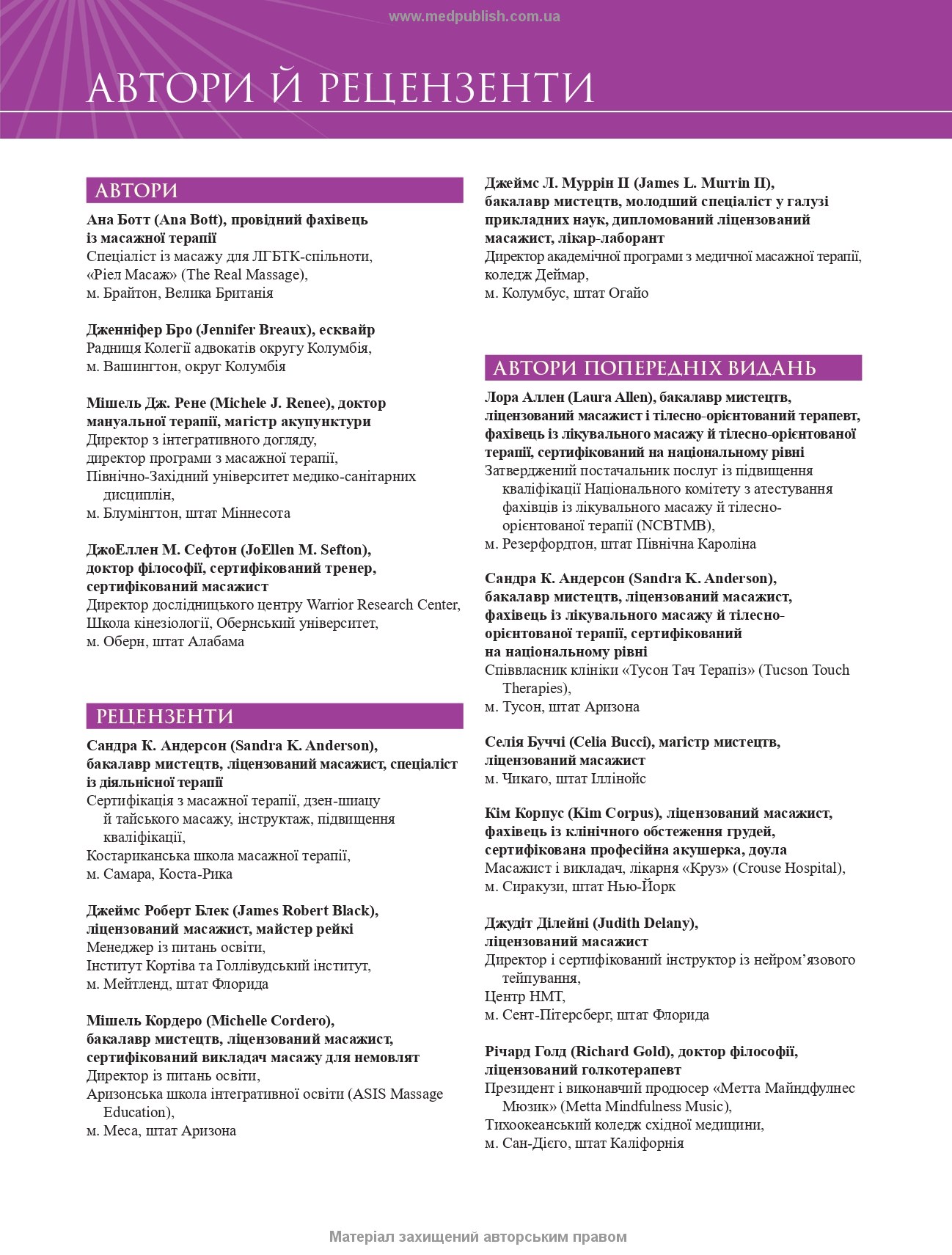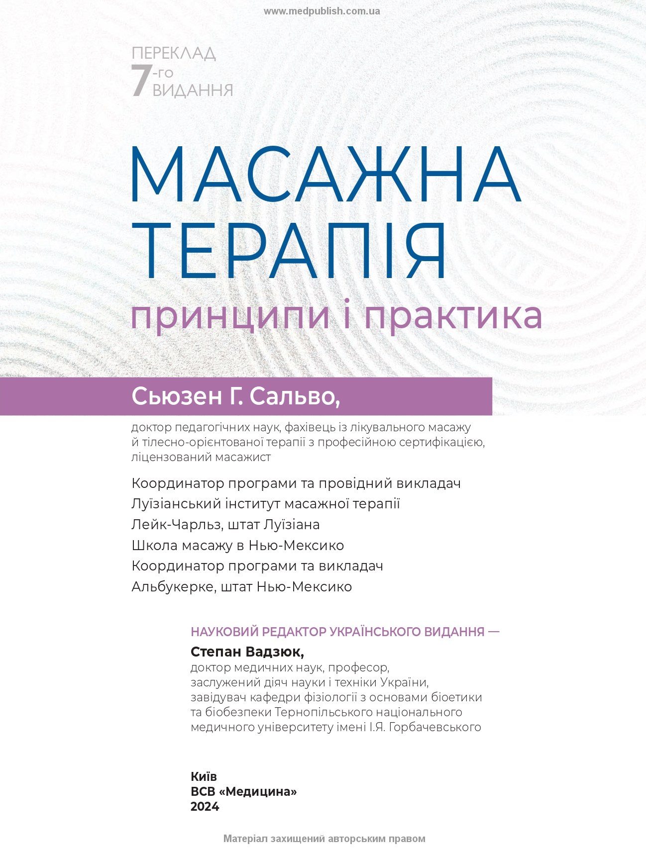 Книга призначена для лікарів-інтернів, практикуючих фізичних терапевтів, реабілітологів, масажистів оздоровчих і лікувальних закладів, а також може бути корисною студентам, викладачам і резидентам медичних закладів вищої освіти.