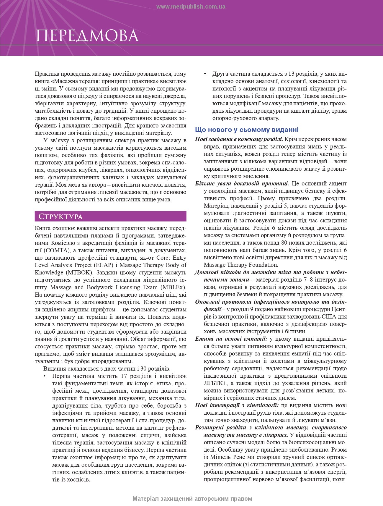 Книга охоплює основи й техніки масажу, анатомію, фізіологію, кінезіологію та патологію, у ній доступно й зрозуміло викладено основні поняття, що допоможе підготуватися до занять, ліцензійних і сертифікаційних іспитів, а також впевнено застосовувати їх у професійній практиці.