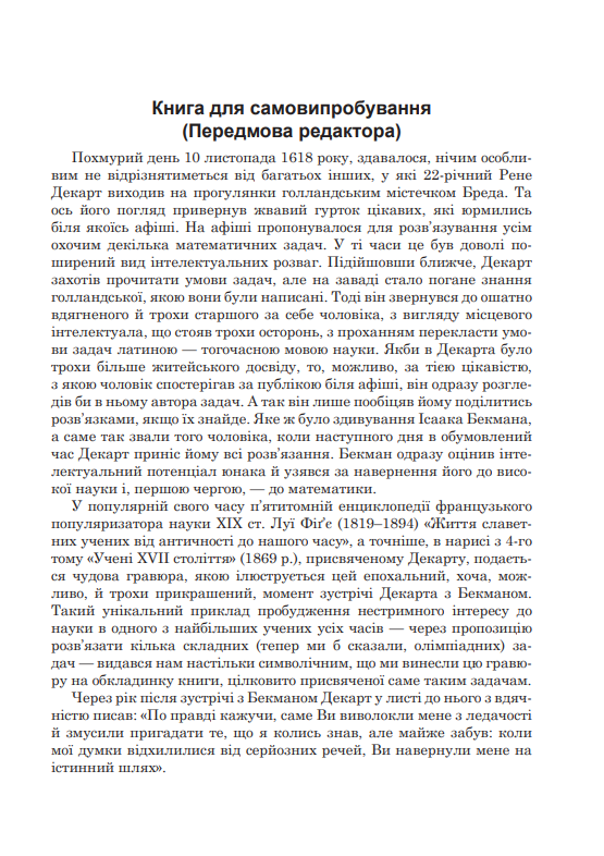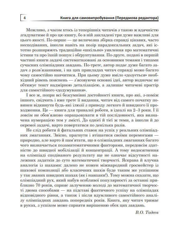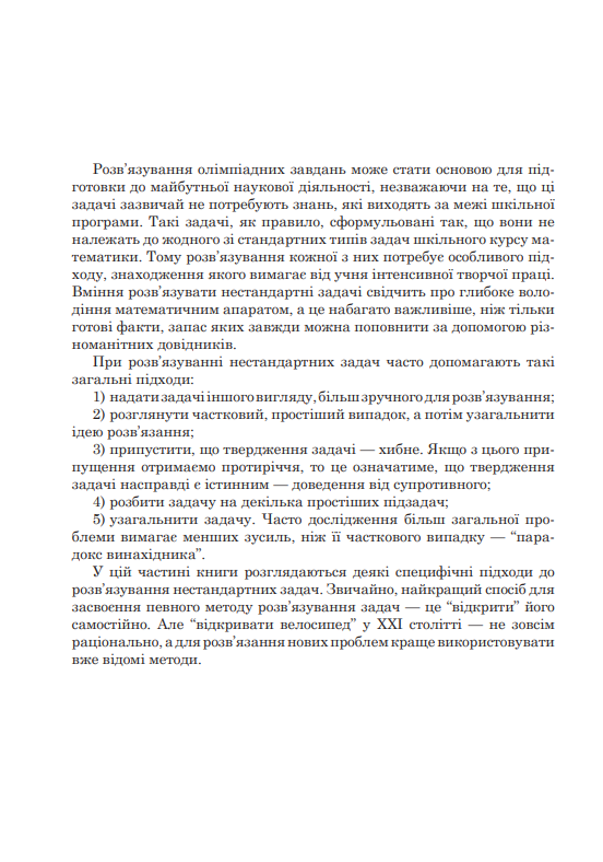 Посібник призначений для проведення факультативної роботи з математики і підготовки учнів до участі в математичних олімпіадах. У посібнику описані основні методи та ідеї для розв’язування олімпіадних задач, які недостатньо вивчаються у шкільному курсі математики. Кожен метод супроводжується теоретичним обґрунтуванням, прикладами розв’язаних задач та задачами для самостійного розв’язування. Всього запропоновано понад 1000 задач, з них 270 задач подано з розв’язаннями, а до інших даються відповіді або вказівки. Уміщено приклади завдань обласних та Всеукраїнських олімпіад юних математиків за 1997–2002, 2009 та 2024 роки. Для учнів старших класів, учителів, викладачів підготовчих курсів, керівників гуртків, студентів математичних спеціальностей вищих навчальних закладів.