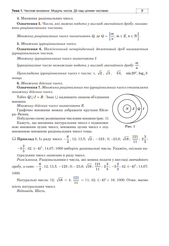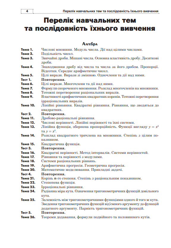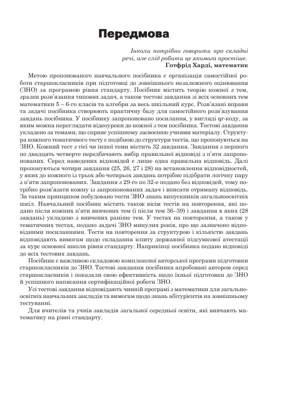 Випускники закладів освіти, які здобувають повну загальну середню освіту, обов’язково складають державну підсумкову атестацію (ДПА) у формі зовнішнього нележеного оцінювання (ЗНО) з математики. Здобувачі освіти, яким результат ЗНО з математики має зараховуватися як оцінка за ДПА, отримають її за результатами виконання завдань рівня стандарту, якщо вивчали математику на рівні стандарту, або рівня стандарту та профільного рівня, якщо вивчали математику на профільному рівні. Метою пропонованого навчального посібника є організація самостійної роботи учнів при підготовці до ЗНО за програмою рівня стандарту. У посібнику викладена теорія зі всіх основних тем шкільного курсу алгебри, запропоновано розв’язання низки задач, що роз’яснюють теорію. До кожної теми укладено тематичний тест за типологією тесту ЗНО. Після кожної групи тем подано тест на повторення вивченого матеріалу, який укладено подібно до тесту ЗНО рівня стандарту. До всіх завдань тестів є відповіді. При вивченні теорії тієї чи іншої теми можна переглядати відеуроки, на які наведено посилання. Усі тестові завдання відповідають чинній програмі з математики для закладів загальної середньої освіти рівня стандарту та вимогам щодо написання сертифікаційної роботи ЗНО. Для вчителів та учнів закладів загальної середньої освіти, які вивчають математику на рівні стандарту.
