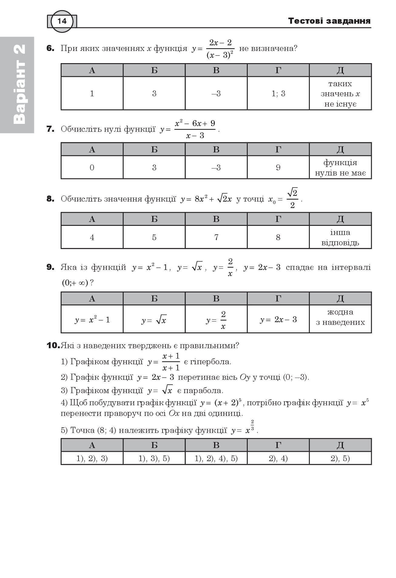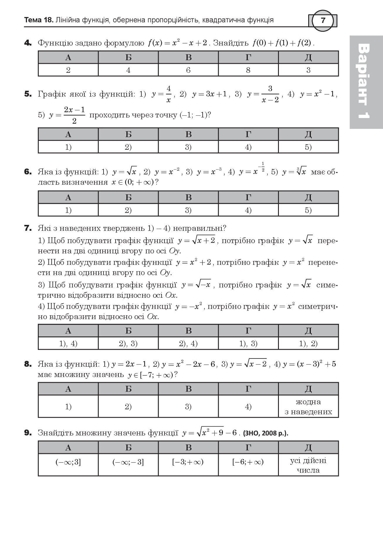 Метою пропонованого навчального посібника є організація самостійної роботи учнів при підготовці до зовнішнього незалежного оцінювання (ЗНО). Тестові завдання частини ІІ містять тематичні тестові завдання, укладені у двох рівноцінних варіантах до двадцяти тем з алгебри та початків аналізу.