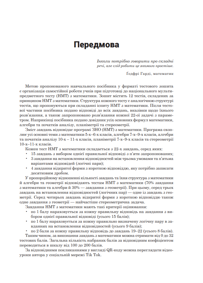 Посібник укладено відповідно до вимог чинних програм з математики для закладів загальної середньої освіти й програми ЗНО. Збірник містить 12 орієнтовних варіантів національного мультипредметного тесту (НМТ) з математики. Для учнів, абітурієнтів та вчителів-математиків.