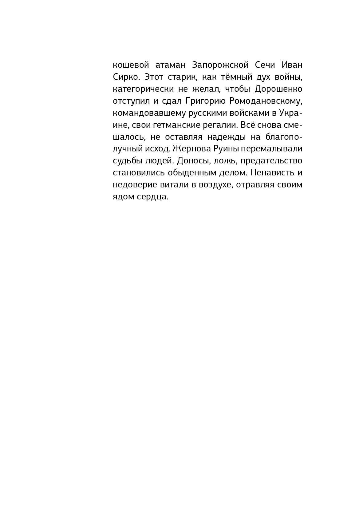 Це перший художній твір відомої дослідниці Гетьманщини Тетяни Таїрової. Книга розповідає про поворотний та трагічний епізод у долі майбутнього гетьмана України Івана Мазепи. Події відбуваються за часів Руїни — трагічного періоду історії козацької України: розкол Гетьманщини, кривава усобиця, боротьба за владу. Тетяна Таїрова не ставить і не вирішує наукових завдань, але дозволяє відчути атмосферу епохи та задуматися про чимало непростих питань, далеких від історії…