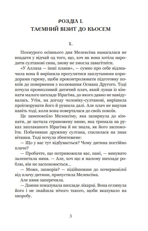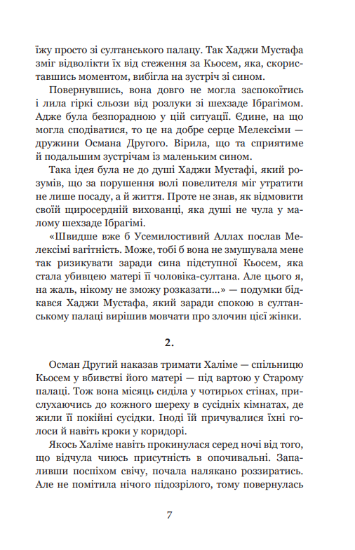 Подіям із життя юного Османа Другого у перші роки його правління присвячена друга книга роману. В ній ідеться про палацові інтриги та боротьбу сановників за вплив на недосвідченого султана, який мав серйозні політичні й військові амбіції. Яку роль у вирі цих подій відігравала кохана дружина Османа Другого – українка Мелексіма? Та як почувались у Старому палаці владні жінки Кьосем і Халіме, котрі занапастили валіде Махфіруз? Про все це оповідається у другій книзі роману.