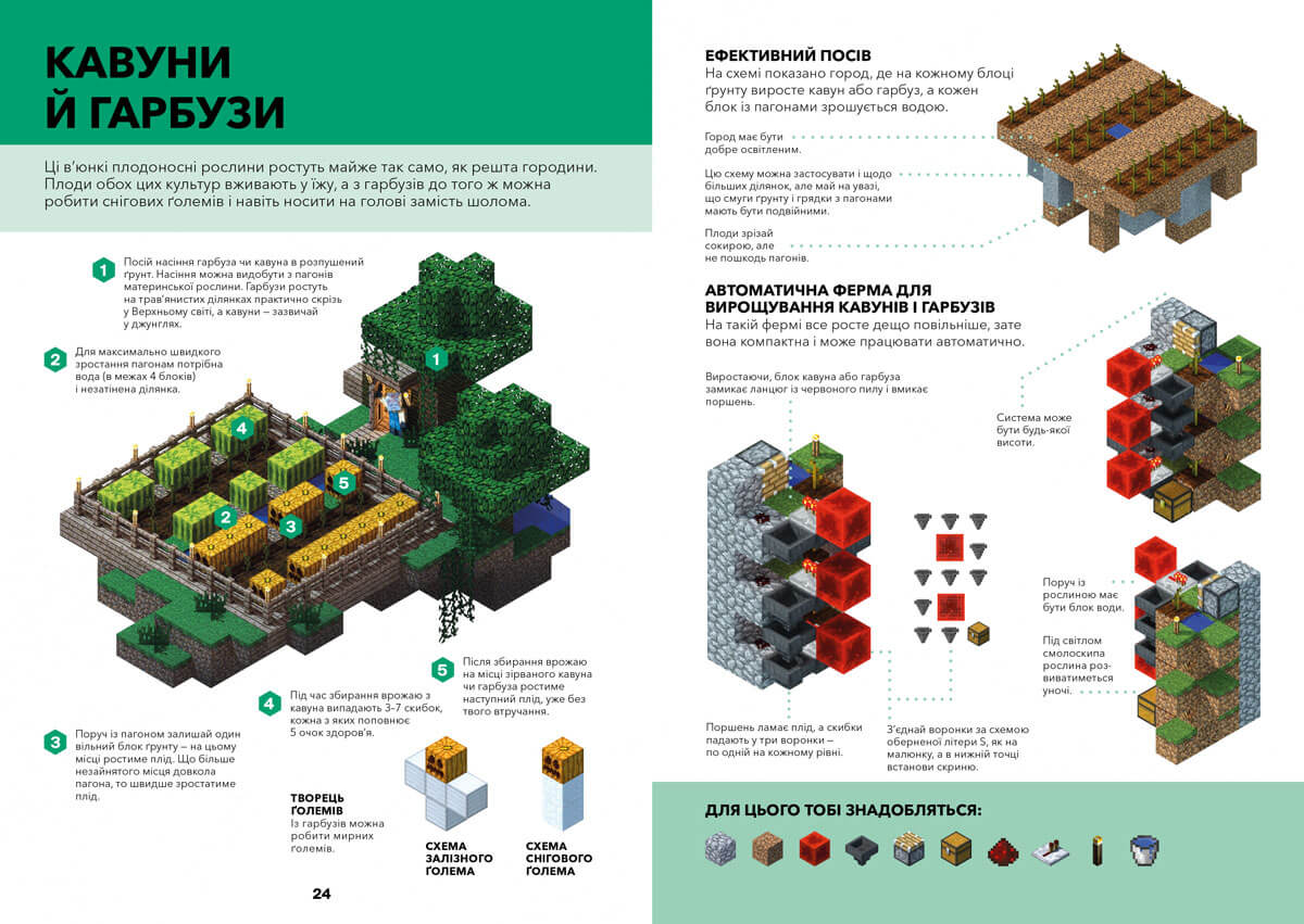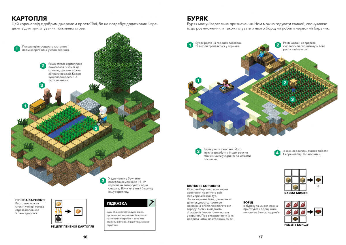 У режимі виживання постійно потрібні продукти харчування, блоки та предмети. Де брати їжу? Виростити власноруч! Засіюй город, сади картоплю та буряк, кавуни та гарбузи, а ще заводь домашніх тварин. Як? Про це детально читай у посібнику «MINECRAFT. Довідник Фермера». Тут є все, що треба знати фермеру-початківцю: покрокові інструкції, як садити овочі та збирати врожай, як отримати корисні предмети та цінні блоки від ворожих мобів.