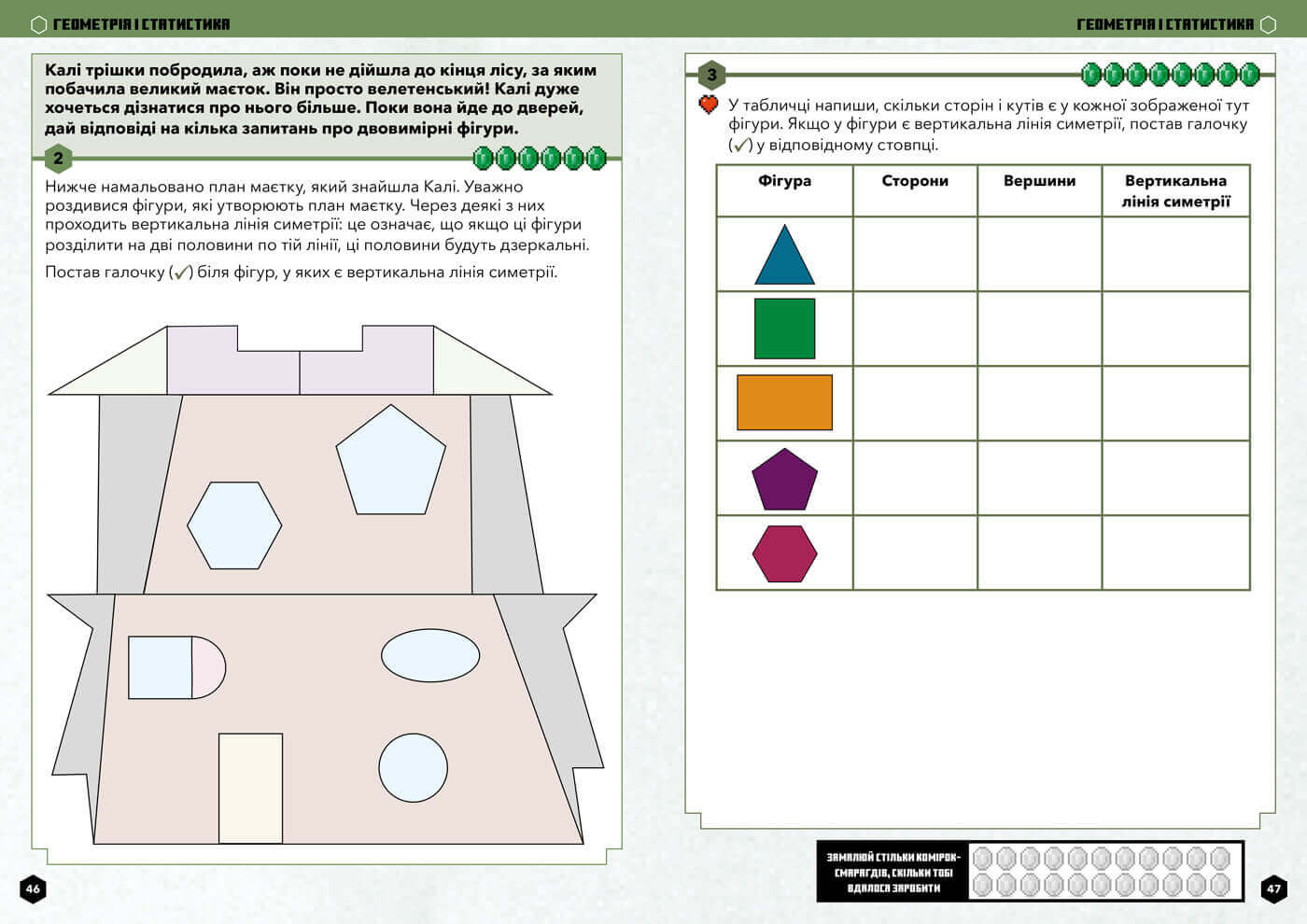 · Дитина в ігровій формі розв’язуватиме тематичні задачі та за кожну відповідь зароблятиме певну кількість смарагдів. Згодом їх можна буде «обміняти» на останній сторінці.