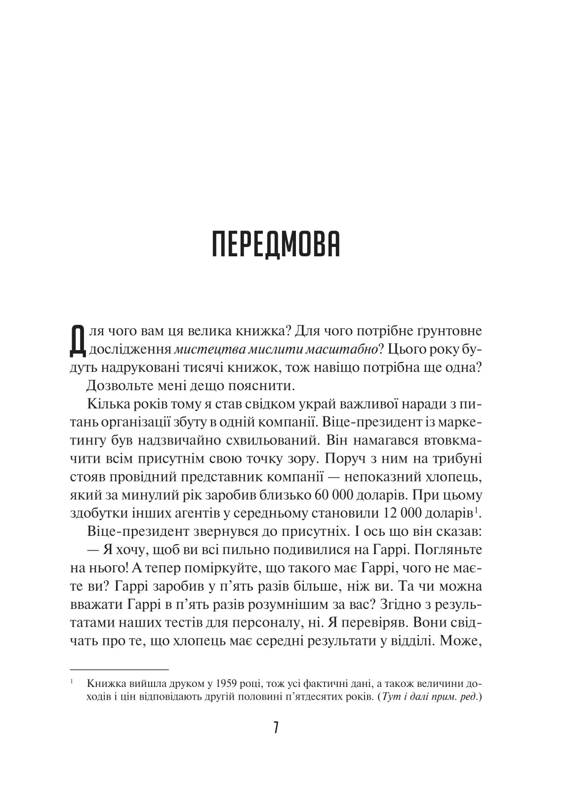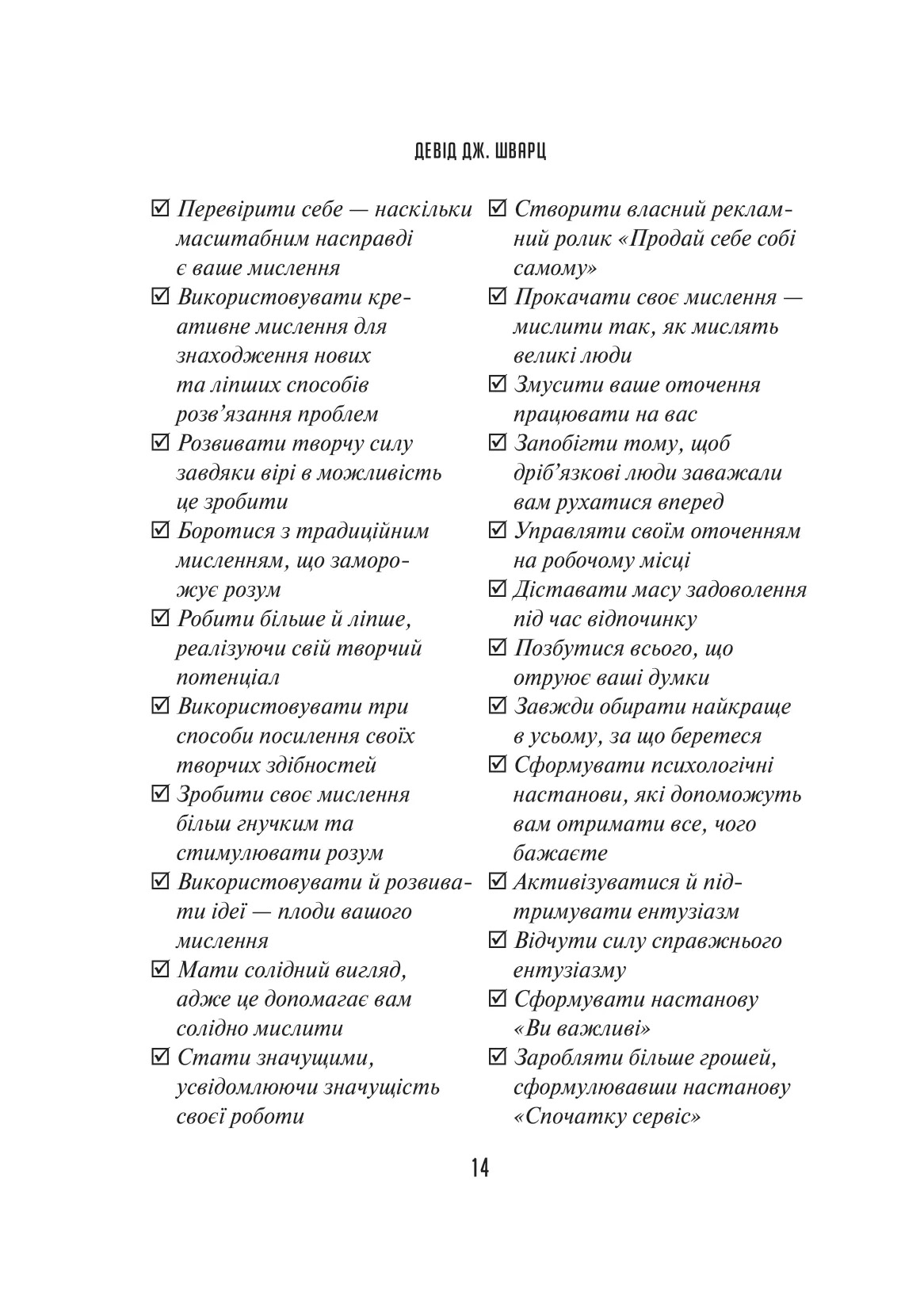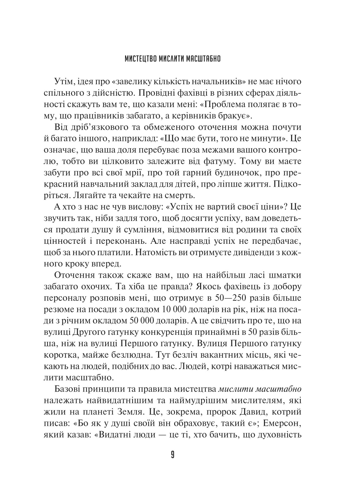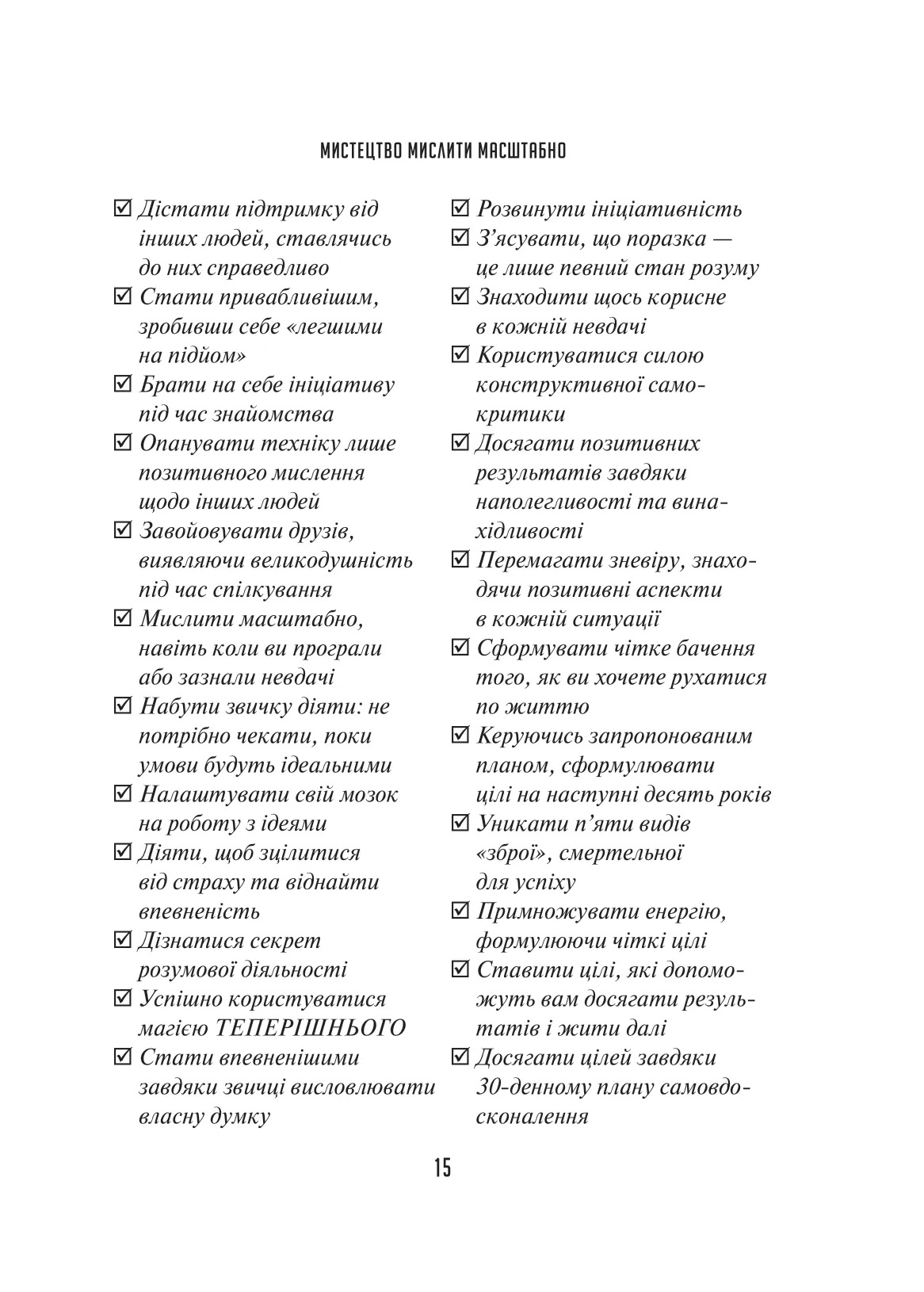 Мільйони читачів дізналися секрети успіху у житті, скориставшись магією мистецтва мислити масштабно.Книжка доктора Девіда Дж. Шварца вже стала класикою в царині мотиваційної літератури,що містить легкі для сприйняття й доступні,а проте потужні й дієві думки,актуальні для кожного,хто хоче досягти більшого. Автор презентує ретельно розроблену програму,у якій радить,як побороти руйнівну зневіру та налаштуватися на позитивне мислення,як навчитися здобувати більшого результату в роботі й особистих стосунках та задіяти весь арсенал своїх творчих здібностей. Він доводить:не треба бути визначним інтулектуалом або мати вроджений талант,щоб досягти великого успіху чи відчути справжню втіху від життя. Варто розпочати з опанування внутрішньої сили та своїх навичок мислити масштабно й ефективно.