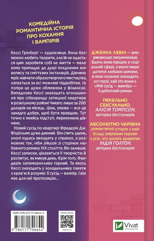 любовного роману ХІХ століття. Він залишає Кессі записки, цікавиться її творчістю і розпитує, як минув день. Крім того, Фредерік запаморочливо гарний. Та якось Кессі знаходить у холодильнику пакети з кров’ю і розуміє: її сусід — вампір. І він має для неї пропозицію…
