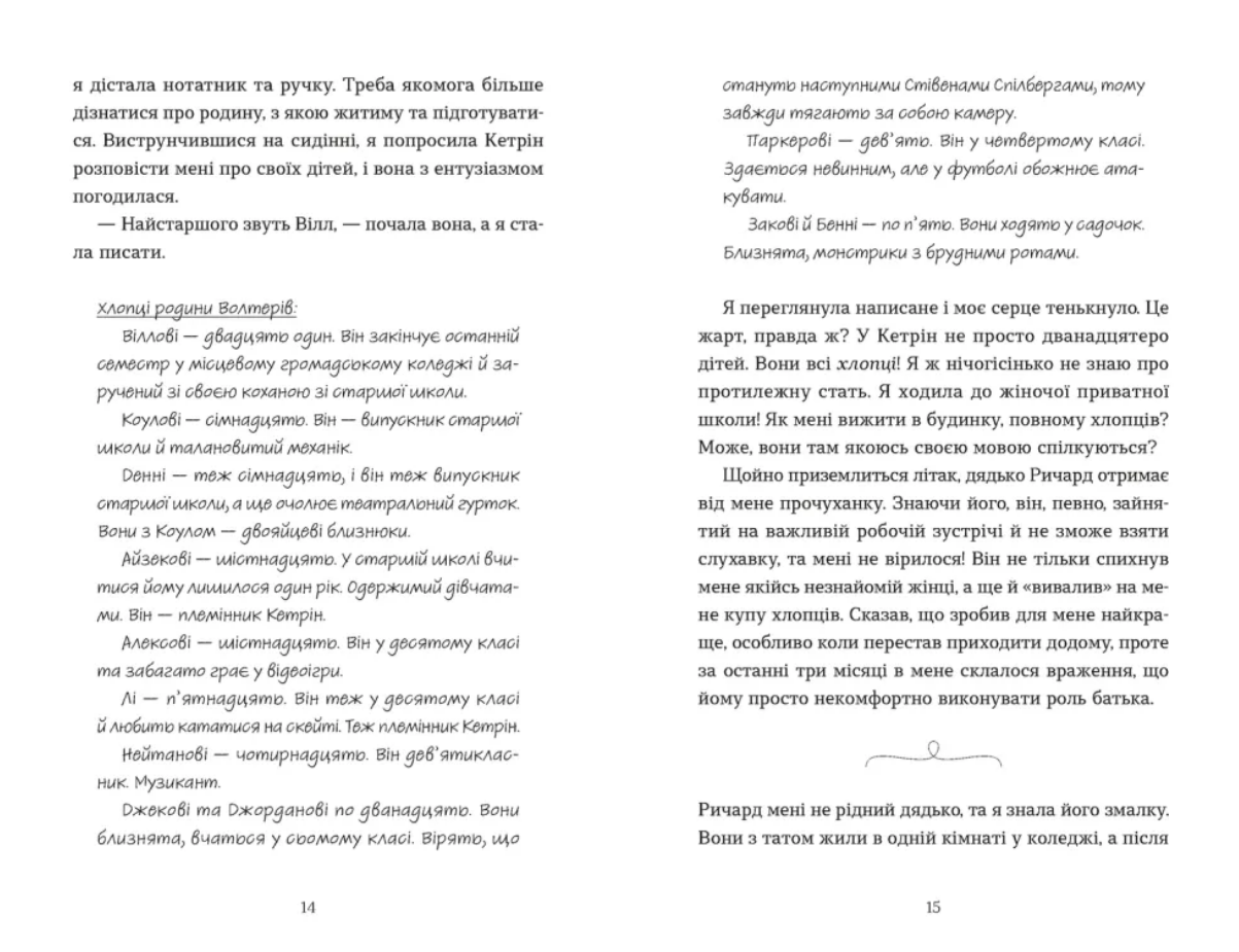 Сюрприз номер 1 — у Волтерів дванадцять дітей, і майже всі вони — хлопці. Сюрприз номер 2 — старші брати неймовірні красунчики. Сюрприз номер 3 — черга до ранкового душу здається нескінченною. Сюрприз номер 4 — пранки, розіграші та суперечки тепер стали частиною її життя. І сюрприз номер 5 — навіть у найскладніших обставинах можна знайти близьких людей і любов.