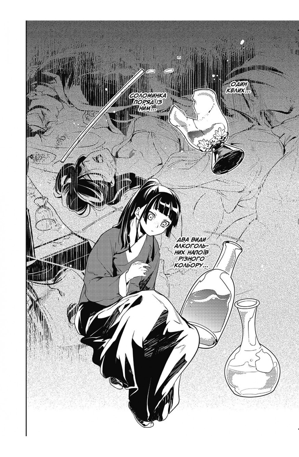 Розібравшись, разом із паном Джінші, з отруйною стравою на імператорському бенкеті, Маомао використовує одну із канзаші, яку отримала на садовій вечірці, щоб, уперше за десять місяців, навідатися до рідного дому у районі розваг.
