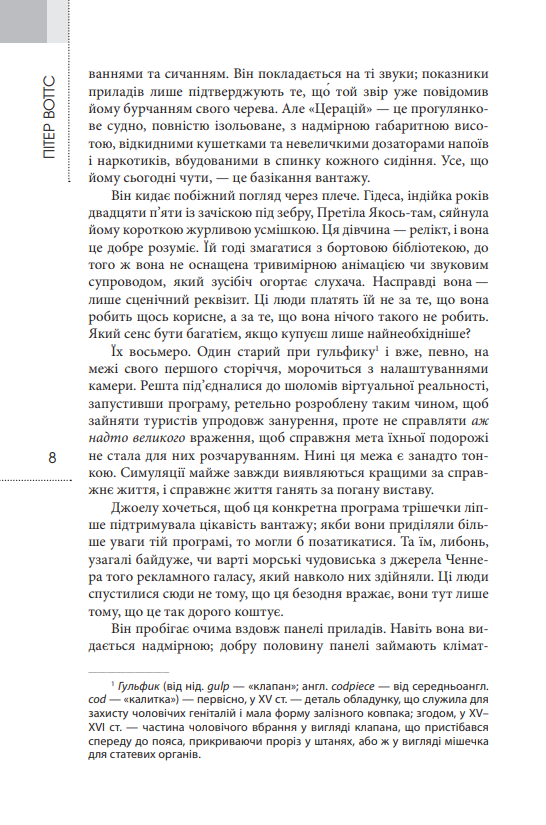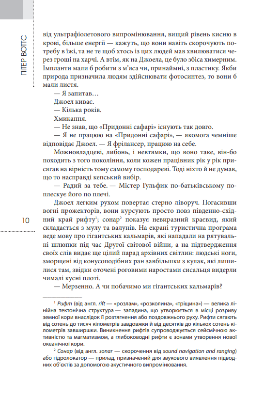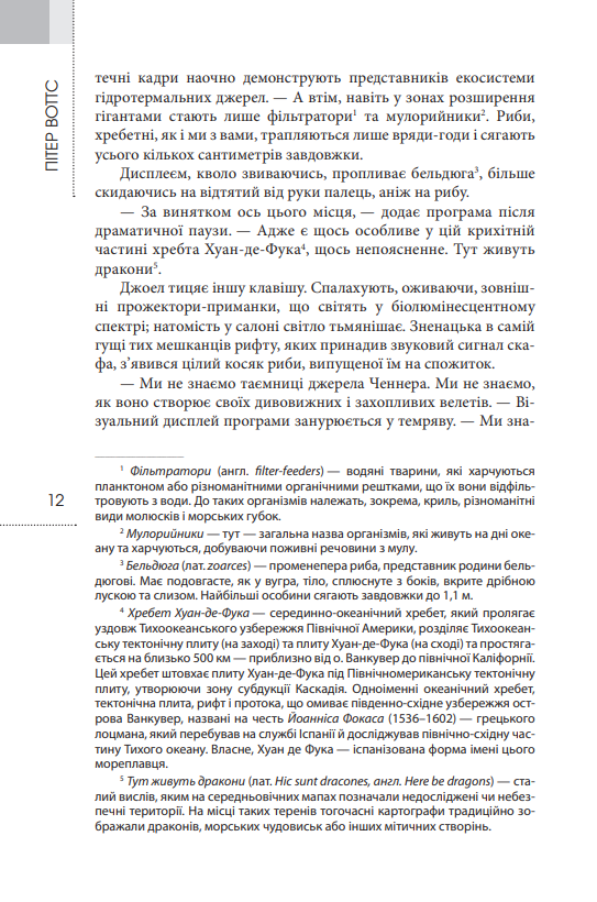 «Морська зірка» – перший роман трилогії «Рифтери», з якої почався шлях Пітера Воттса до всесвітньої слави одного з найпотужніших і найяскравіших представників світового пантеону майстрів жорсткої наукової фантастики (hard sci-fi). На відміну від більшості наступних циклів, у «Рифтерах» письменник зосереджується на питаннях найближчого майбутнього людства на Землі, коли ми, на думку Воттса-вченого, вже невдовзі зіштовхнемося з неминучими екологічними й енергетичними проблемами, що накладуться на проблеми масштабних міграцій, ще більшого соціального й культурного розшарування суспільства і нескінченного ланцюжка економічних криз. Усе це ми вже маємо змогу спостерігати на власні очі, і, вочевидь, під знаками цих недобрих провіщень пройде принаймні перша половина ХХІ сторіччя.