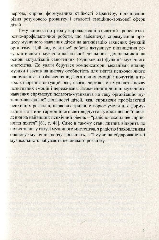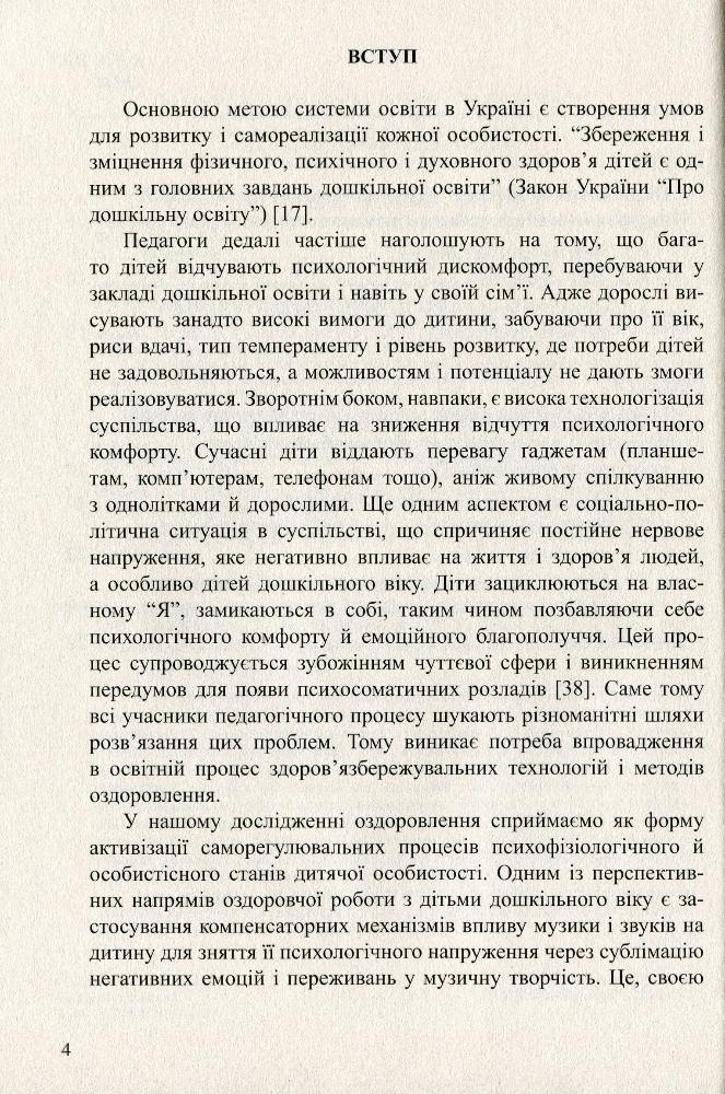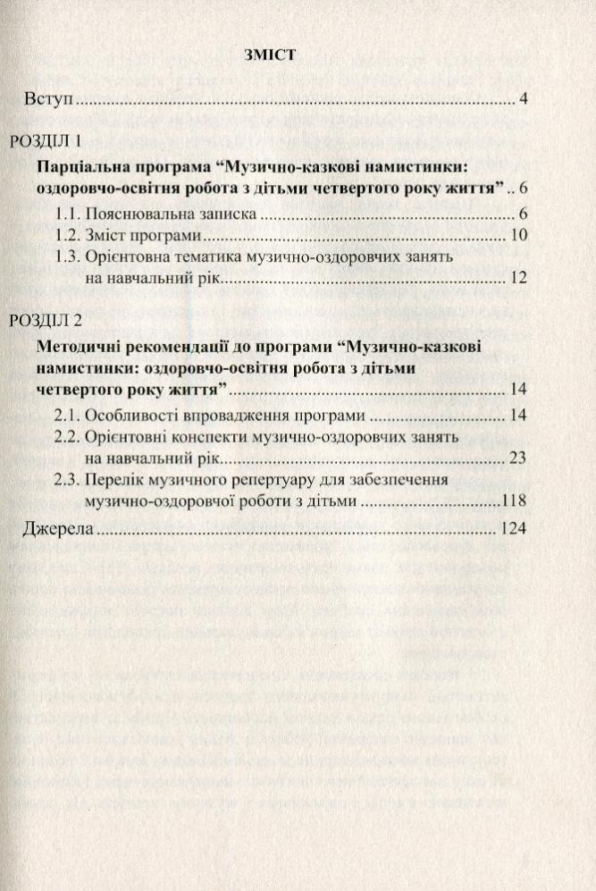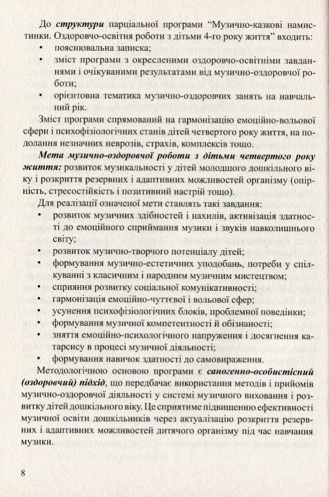 Посібник створений для використання в освітньому процесі сучасних закладів дошкільної і позашкільної освіти та містить програму і методичні рекомендації оздоровчо-освітньої роботи з дітьми 4-го року життя. Рекомендовано педагогам для реалізації варіативної складової Базового компонента дошкільної освіти (гурткова робота) або як корекційна діяльність музичних керівників із дітьми, які потребують особливої уваги. Освітній зміст методичного посібника розроблено відповідно до вимог Базового компонента дошкільної освіти. Оздоровчий зміст посібника створен для гармонізації емоційно-психофізіологічних станів дітей молодшого дошкільного віку (для усунення страхів, проблем поведінки, профілактики і запобігання неврозів тощо) на підставі сучасних наукових досліджень і досягнення. Для музичних керівників, практичних психологів, учителів-логопедів, учителів-дефектологів, вихователів закладів дошкільної освіти для використання в роботі з дітьми молодшого дошкільного віку.