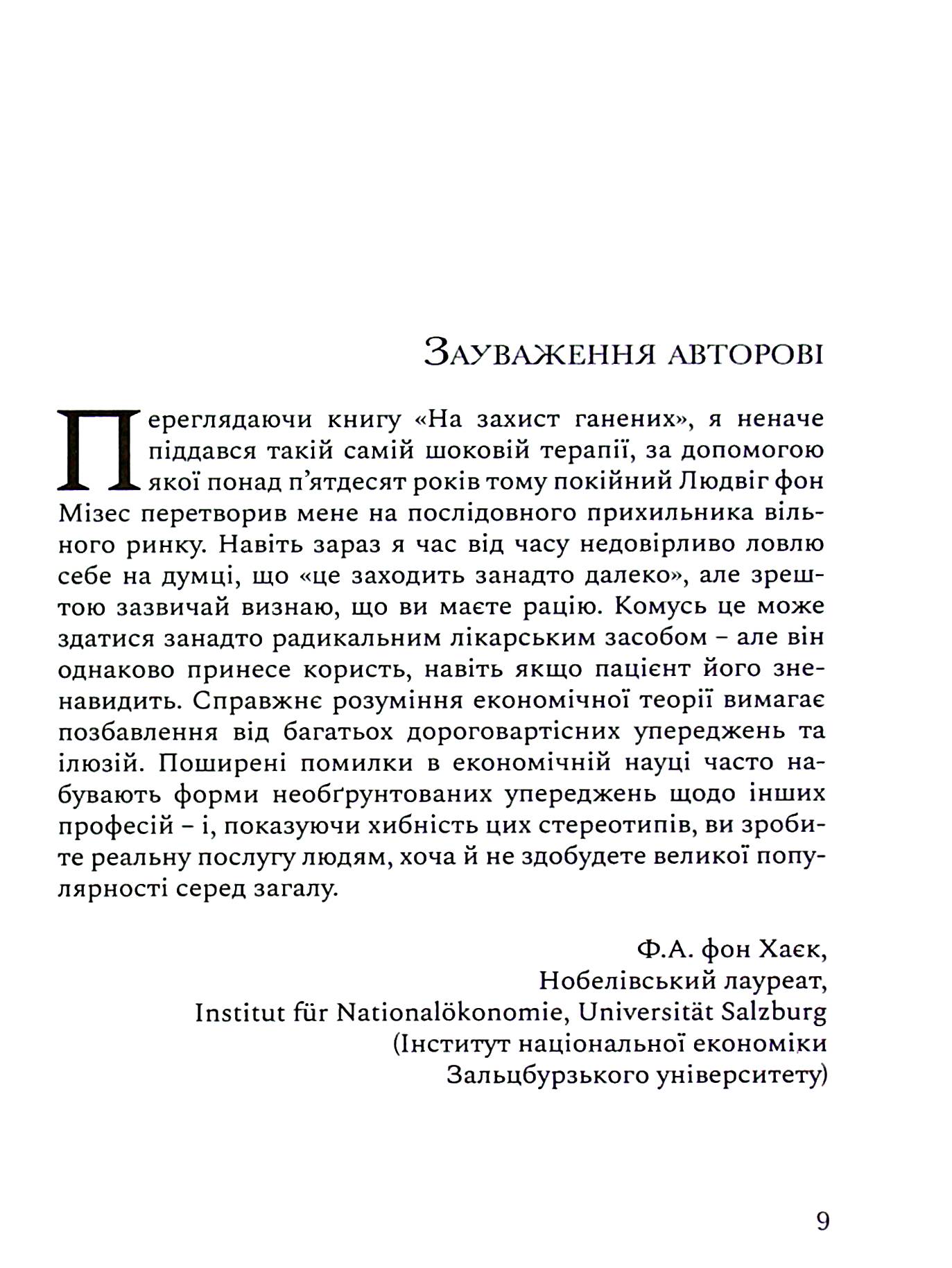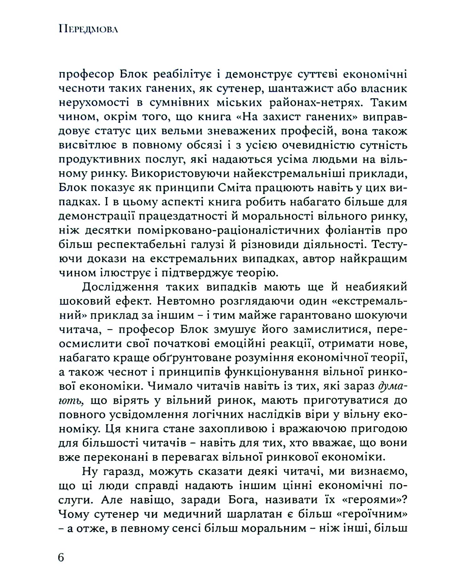 У книзі “На захист ганених” професор Уолтер Блок досліджує типи, що засуджуються громадськістю: сутенер, повія, штрейкбрехер, наркоторговець, шантажист, спекулянт, лихвар, наклепник та інші. З позиції лібертаріанської етики автор ламає усталені стереотипи, які, на перший погляд, здаються нам непорушними істинами. Уолтер Блок викликає читача на безкомпромісний інтелектуальний поєдинок, у якому борються за допомогою аргументів замість вірувань. Для нашої читацької авдиторії це справжній виклик або як любить говорити молодь: “вибух мозку”. Тим цікавіше вступити в цей поєдинок для всіх читачів, які здатні неупереджено і з відвагою йти за думкою автора.