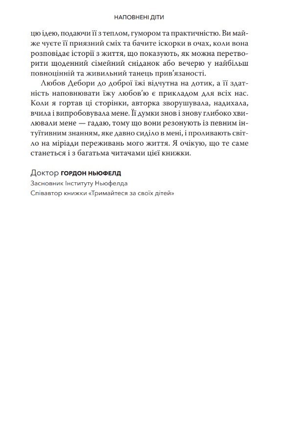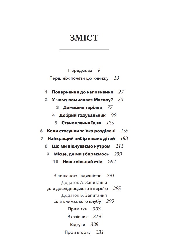 Докторка, клінічна психологиня та авторка Дебора Макнамара досліджує дитячий та підлітковий розвиток. Вона поспілкувалась та опитала шеф-кухарів, дієтологів, нутриціологів та спеціалістів із розладів харчової поведінки, а також батьків (мам, тат, дідусів та бабусь), і дійшла висновку як наповнити наших дітей і пояснює чому їжа не головна, а сімейні спільні вечері найперше про запрошення та прийняття, а вже потім про насичення.