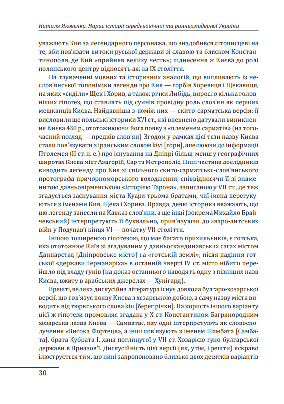 «Нарис історії середньовічної та ранньомодерної України» — це стисла розповідь про десять століть української історії (IX—XVIII ст.), яка представлена як тривалий процес цивілізаційних зустрічей (Заходу і Сходу, православ'я та ісламу, католицтва й православ'я), як результат взаємодії та конфліктів різних держав, етнічних і соціальних груп. Особливу увагу надано людині — колу її прав та обов’язків, звичній поведінці та в моменти зламу усталених цінностей. Не оминає Наталя Яковенко й дискусійних питань. Як належить сприймати культурну спадщину Київської Русі? Чим була Хмельниччина — становою козацькою революцією, громадянською війною чи війною за національне визволення? Як пояснити суперечливість постаті Івана Мазепи? Строгість наукового викладу та витонченість стилю роблять цю книжку водночас і серйозною, і захопливою для читання.