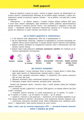«Навчалочка» — оновлене ювілейне видання! Якщо ви збираєтеся облаштовувати заняття з дошкільнятком, значить вам точно сподобається ця серія. Протягом 10 років дітки зростали і розвивалися разом із «Навчалочкою». Час не стоїть на місці, тому ми вдосконалили книги серії: Цілком оновили оформлення. Додали творчі види діяльності: (аплікація, малювання, саморобки). Переглянули структуру й завдання на відповідність сучасним програмам, методикам і внесли необхідні корективи.