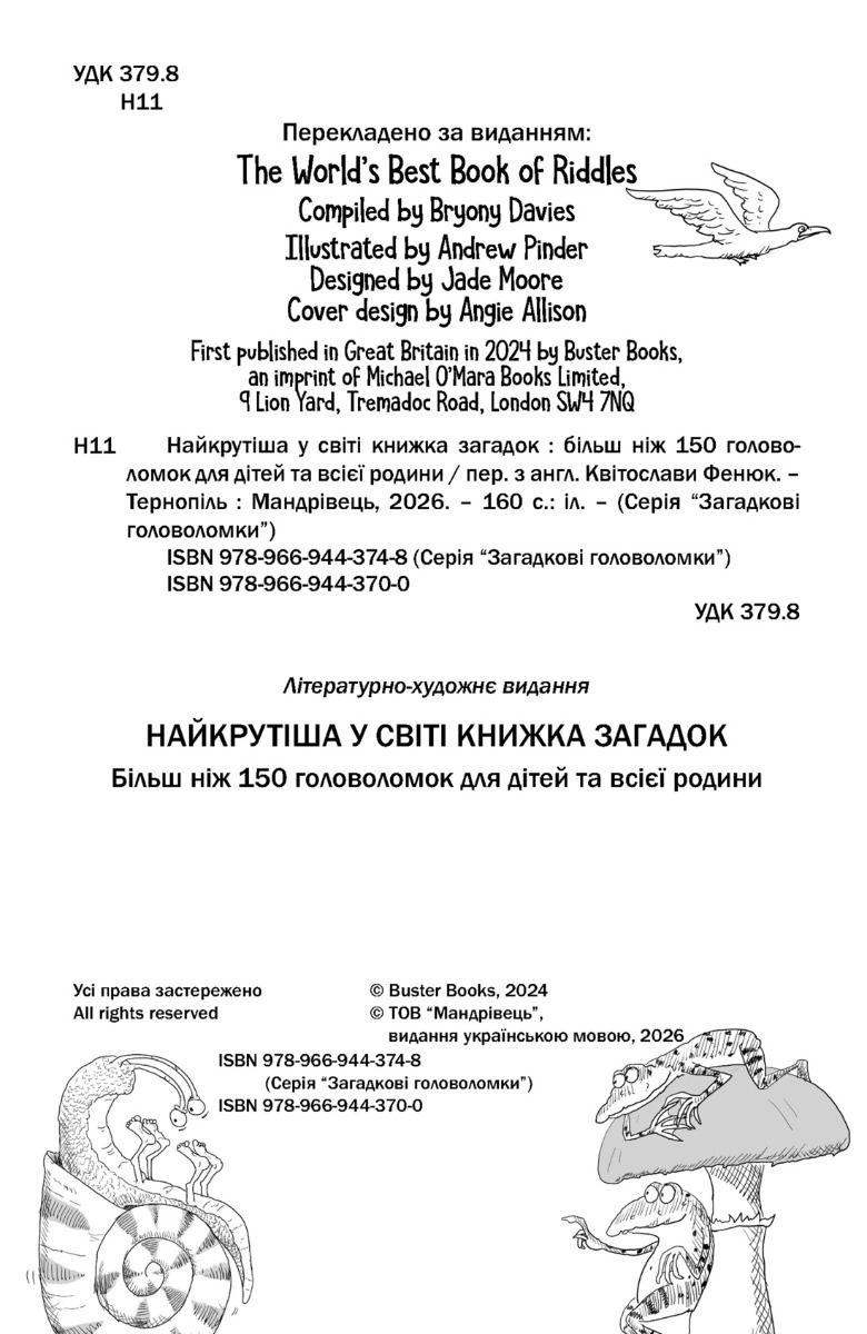 Перевіриш свою кмітливість? На тебе чекають хитромудрі завдання й жартівливі загадки, що здатні збурити цілий вир ідей. А коли впораєшся, кидай виклик друзям і родині – нехай теж спробують свої сили! Мозок потребує тренувань так само, як і м’язи. Що більше загадок ти розв’яжеш, то ліпше працюватиме твій розум.