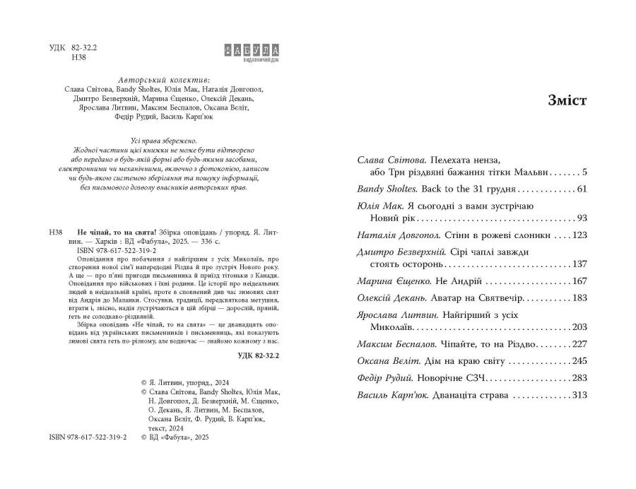 Збірка оповідань «Не чіпай, то на свята» — це дванадцять оповідань від українських письменників і письменниць, які показують зимові свята геть по-різному, але водночас — знайомо кожному з нас.