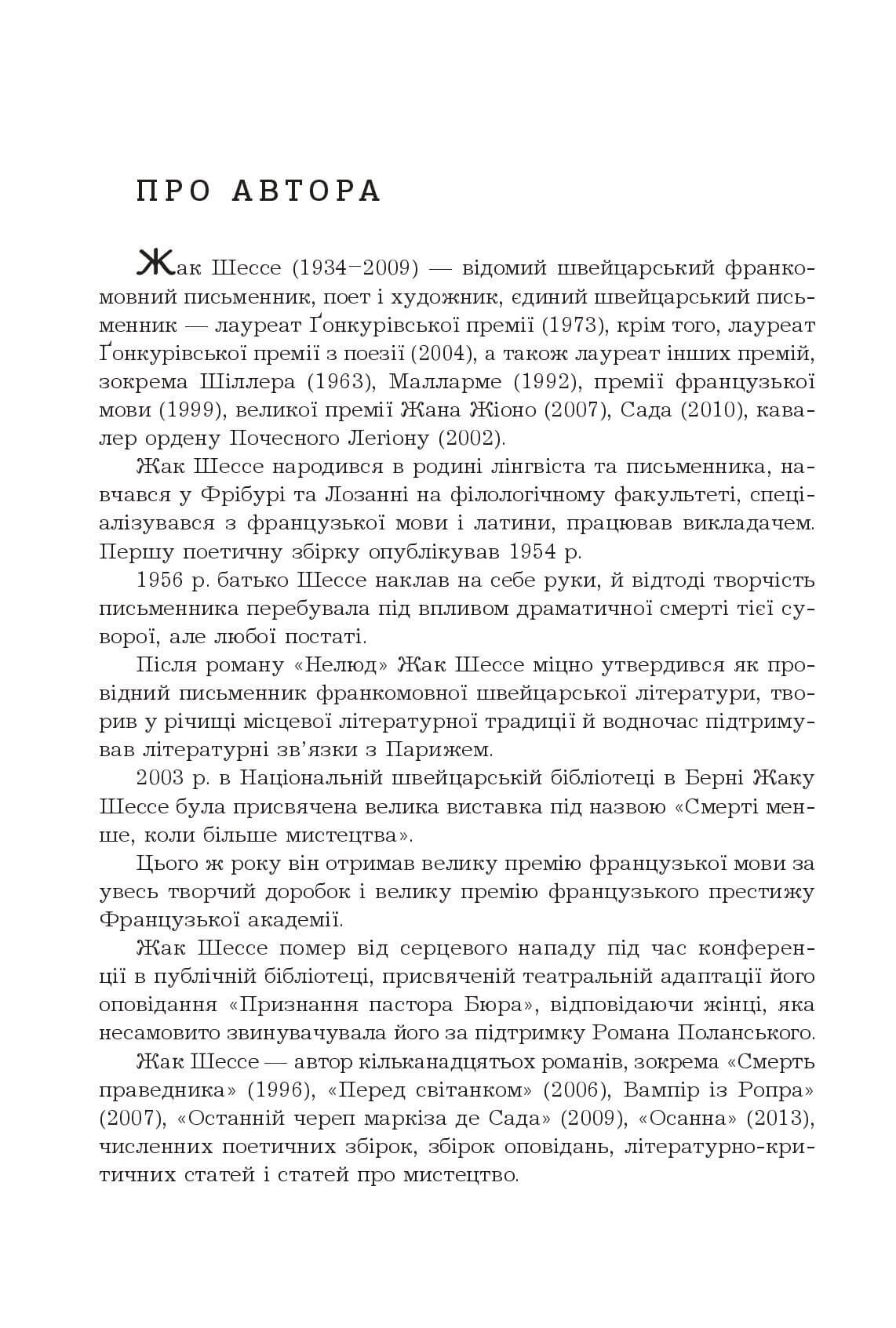 Відзначений Ґонкурівською премією (1973) роман «Нелюд» відомого швейцарського письменника Жака Шессе (1934–2009) — розповідь про сина, що до абсурду, моторошного кошмару потрапив у залежність від галасливого і брутального батька-жуїра. Батько помер, і син ховає в могилу своє життя, гіркоту і злиденність якого з діткливою силою описує автор, чергуючи жалісливу мову книги Йова з діонісійською граматикою кохання.