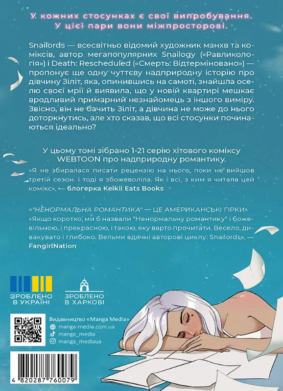 Манхва «Ненормальна романтика» від автора Snailords — це романтична комедія з елементами фантастики про стосунки, дружбу та пошук себе. Сюжет манхви розповідає нам про самотню дівчину Зіліт, яка орендує нову квартиру, а разом з нею і таємничого привида. Але привиди Зіліт не лякають. Особливо, якщо вони такі привабливі.