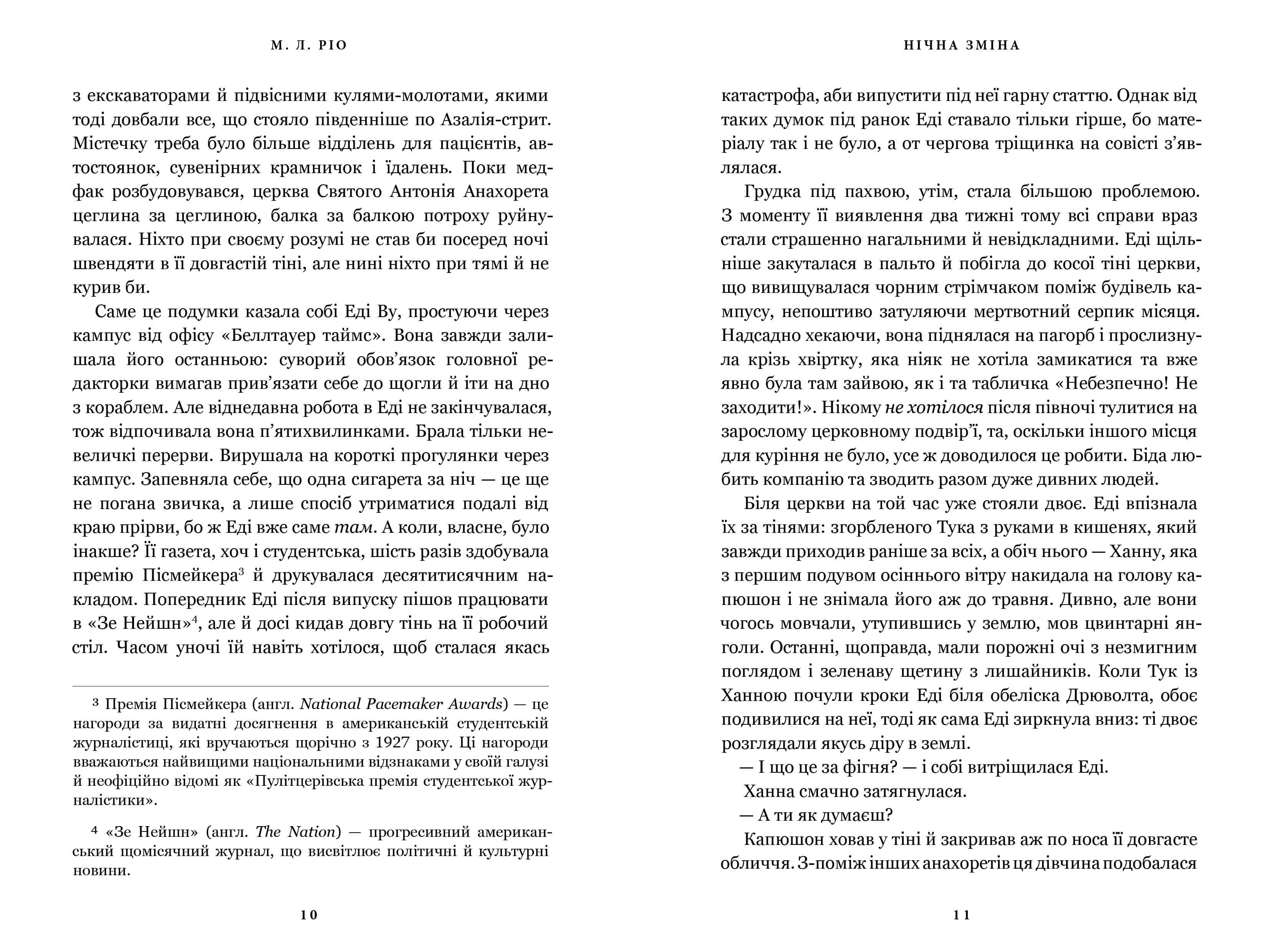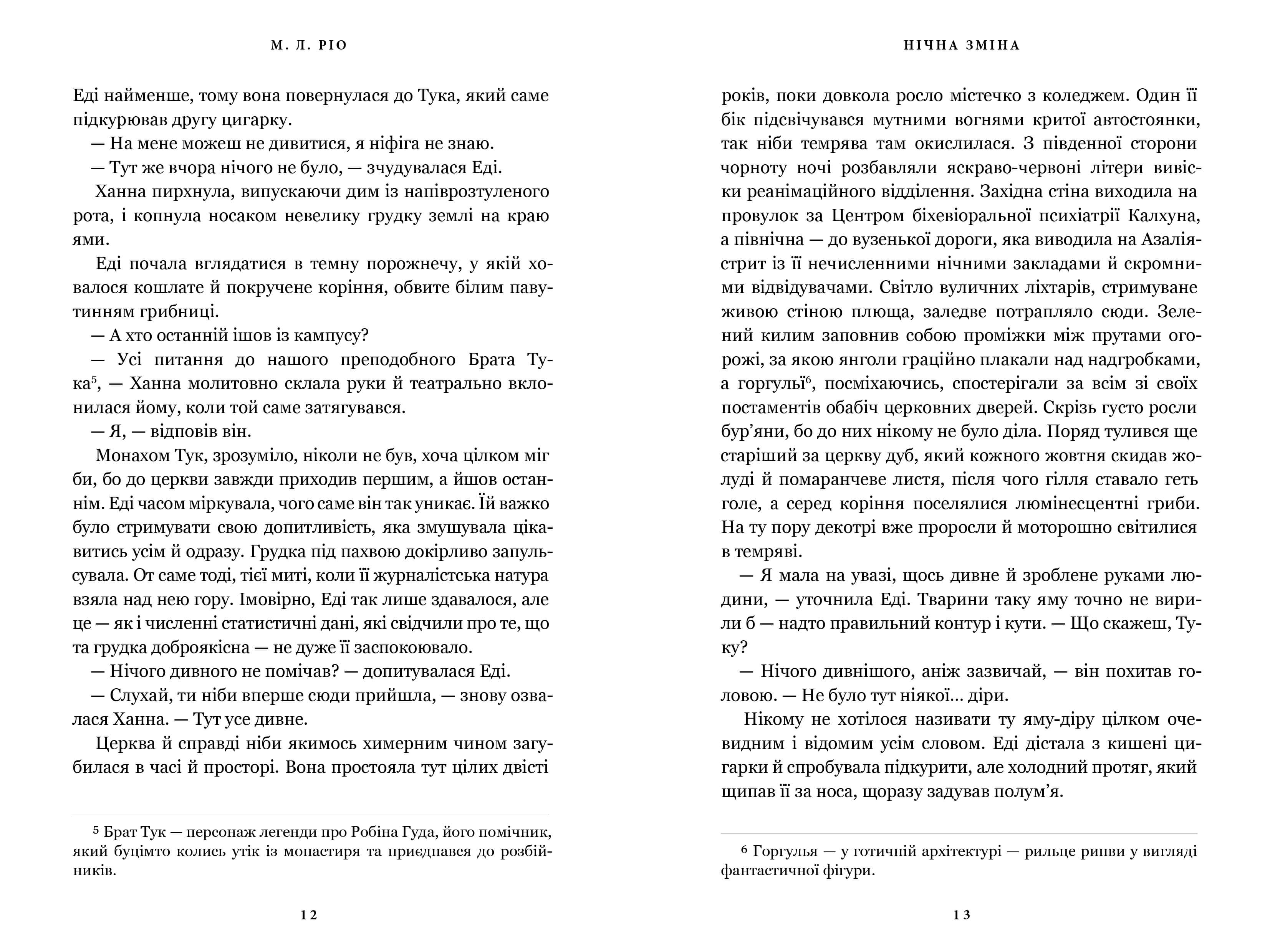 Атмосферна й моторошна, з персонажами, що ніби зійшли зі сторінок п’єси, й академічним підґрунтям, яке так полюбилося фанатам письменниці, «Нічна зміна» — це сучасна готична казка, витримана в неповторному стилі авторки «Ніби ми злодії» М. Л. Ріо.