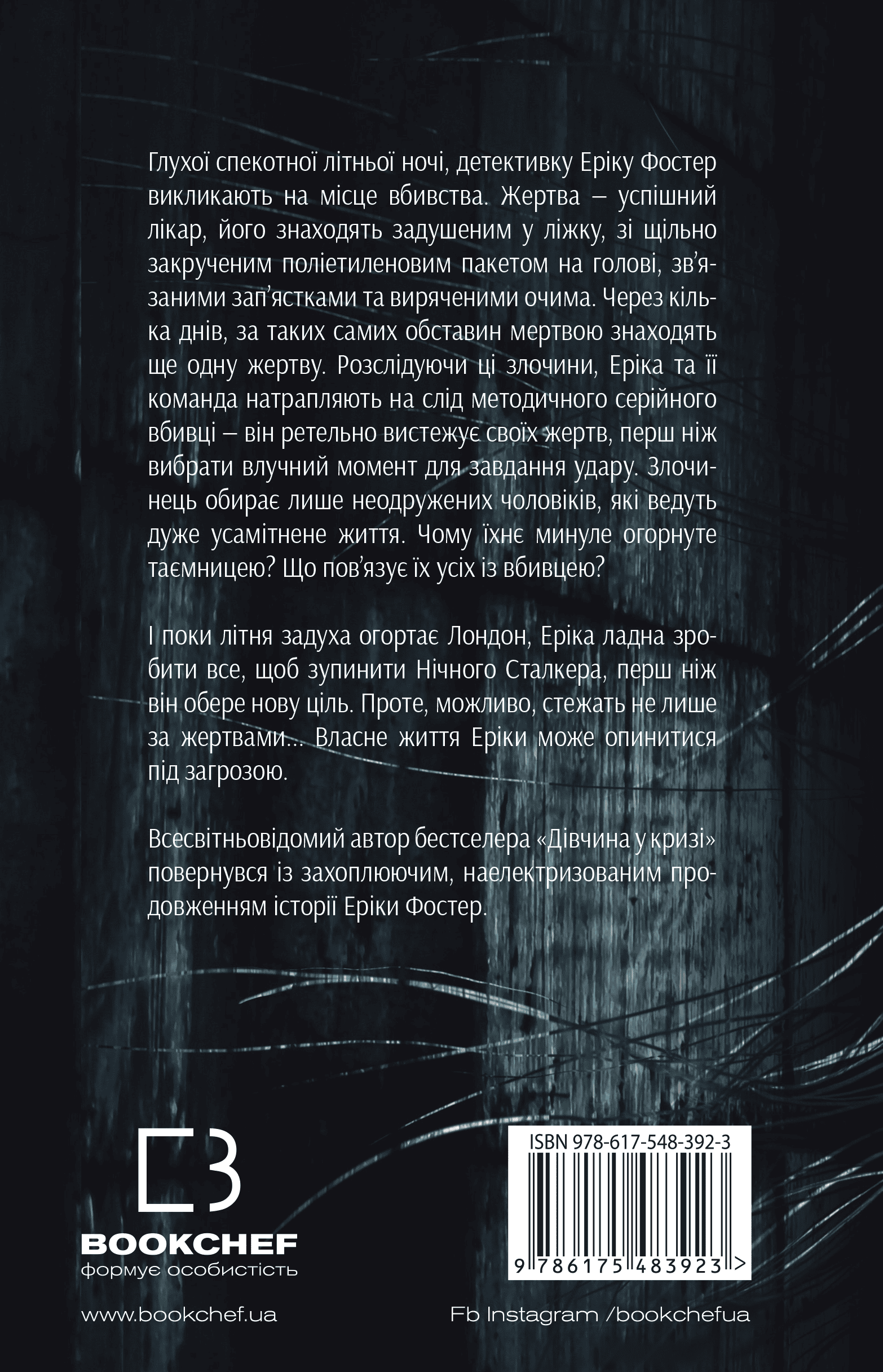І поки літня задуха огортає Лондон, Еріка ладна зробити все, щоб зупинити Нічного Сталкера, перш ніж він обере нову ціль. Проте, можливо, стежать не лише за жертвами... Власне життя Еріки може опинитися під загрозою.