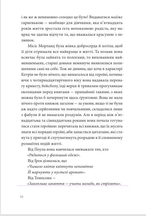 Блискуча пародія Джейн Остін на модні в ті часи готичні романи! Героїня «Нортенґерзького абатства», юна Кетрін Морланд, походить з родини не багатої й не бідної. Освіченою її не назвеш, проте романи Енн Редкліфф вона ковтає залюбки. Коли дівчина досягає віку, у якому пристойно починати вивозити юну дівчину у світ, вона зі своїми добродушними опікунами їде на модний курорт Бат, ідеальне місце для пошуку відповідної пари, де знайомиться з родинами Торпів і Тілні. Кетрін, чия голівка напхана пригодами нещасних дівиць у готичних замках, де на них чигають привиди й злочинці, аж ніяк не можна назвати дурненькою чи недалекою! Попри наївність, вона неймовірно щира, добра й співчутлива. Що ж обіцяє молоденькій провінціалці запрошення нових друзів до величного Нортенґерзького абатства: кохання, дружбу, вірність, чи жахіття й розчарування?