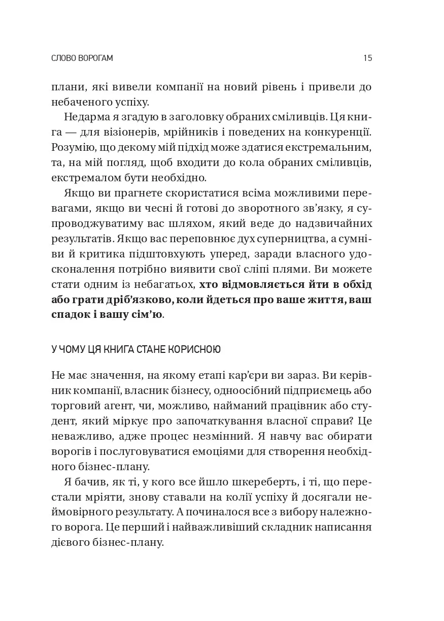 Ви знаєте, хто ваші конкуренти, регулярно стежите за ними й можете перерахувати їхні сильні й слабкі сторони. Але вороги — це зовсім інше. Вони ненавидять, сумніваються, кажуть, що у вас нічого не вийде, руйнують ваші мрії. Коли думаєте про ворогів, ви сповнюєтеся емоціями й упевненістю, що вас не зупинити. Це допомагає прискорити розвиток бізнесу, лідерувати вже зараз і твердо ставати на ноги в майбутньому. Але обирати ворогів потрібно мудро, з розумінням: