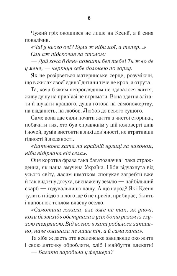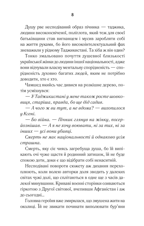 Ксені, як і багатьом українцям, добре знайомі відчуття втрати і щемкої туги за рідним краєм. Але їй не звикати боротися - і нести іскру тепла всюди, де б не опинилася. Але й любов ще довго блукатиме сиротою по світах, знаходячи тимчасовий притулок у ще не спалених серцях…
