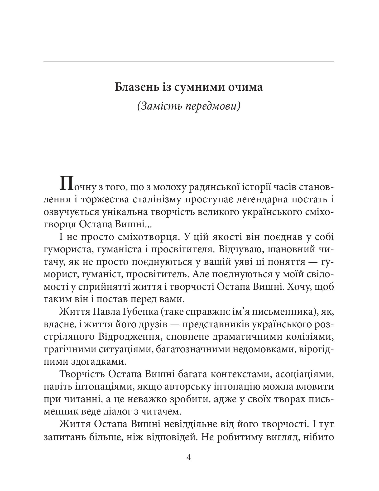Остап Вишня (спражнє ім'я – Павло Михайлович Губенко) - неперевершений майстер сатиричної прози, письменник від народу і для народу, що, проживаючи разом із ним бурхливі й найтяжчі роки радянської дійсності, зумів через фейлетон та гумор дарувати надію й почуття єдності й близькості порозуміння. Він винайшов новий жанр гумористичної прози – усмішки. І вони, Вишневі, розійшлися анекдотами в читацькому середовищі... Людина з загостреним почуттям українськості, письменник болів душею за своїх рідних “чухраїнців”, за жартом приховуючи розпач і біль від безсилля щось змінити. Міг лишень писати – крізь рядки натякаючи на вади дійсності, що коштувало йому свободи і майже життя, але в обмін на те подарувало неминущу любов і повагу українського читача, яку не змогли знищити навіть гидкі совісті письменника контроверсні “антиупівські” твори...