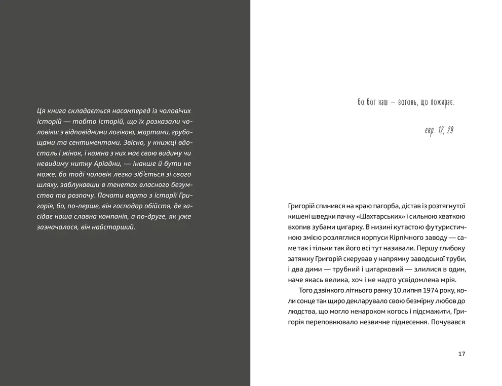 Ось вони, п’ятеро, сидять біля багаття, чаркуються, усміхаються, танцюють, а нам годі зрозуміти, що насправді зібрало їх тут — випадок, чиясь воля чи доля? Цю загадку ще доведеться розплутати, пройшовши з кожним із героїв через його непросте життя — з втратами й ранами, розчаруванням і надією, благородством і любов’ю. Врешті п’ять різних історій сплетуться в один сюжет — шорсткий, правдивий і магічний, з присмаком гіркого тютюну і щемкої ніжності.