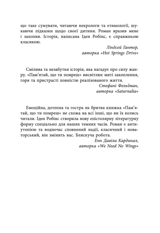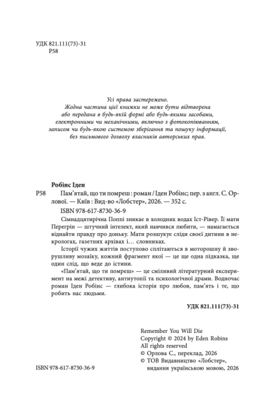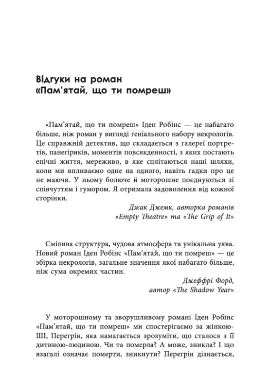 «Пам’ятай, ти помреш» — це жанрово сміливий роман, побудований як ланцюг взаємопов’язаних некрологів і новинних повідомлень, що охоплюють понад три століття. У центрі історії — штучний інтелект на ім’я Перегрін, яка намагається впоратися з горем після загадкової смерті своєї людської доньки й водночас осмислити, що насправді означає бути людиною.