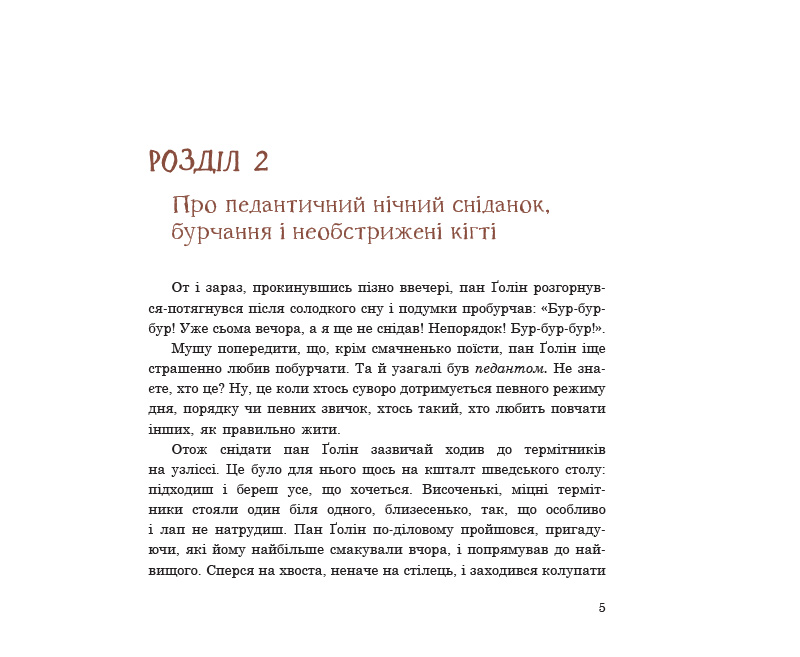 "Історія розповідає про панґоліна на ім'я пан Ґолін, який був справжнім відлюдником. Він ніколи не бачив людей, рідко стикався з іншими тваринами — адже поїсти та прогулятися виходив лише вночі. Ба більше, Ґолін навіть інших панґолінів не бачив! Його мама колись казала, що, можливо, він останній панґолін в усій Азії… Тож Ґолін тільки бурчав і ховався від світу. Та якось настав момент, коли в його розміреному житті все пішло не за правилами. І він… зовсім несподівано вирушив у свою першу мандрівку, повну пригод.