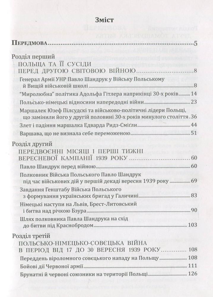 Керівник Генштабу армії УНР на еміграції генерал Павло Шандрук у 1938 році закінчив Вищу військову школу у Варшаві. У 1938–1939 роках став контрактовим підполковником, пізніше полковником Війська Польського. Він досконало знав передвоєнне військове становище Польщі й "миролюбну" політику Адольфа Гітлера та Іосіфа Сталіна, а також події Німецько-польської війни. Книга відкриває надзвичайно цікаві й малознайомі українським читачам сторінки цієї війни – так званої Вересневої кампанії 1939 року. Совєцькі штампи подавали події як "швидку ганебну поразку Польщі від Німеччини й вступ СССР у війну для захисту братніх українського і білоруського народів". Насправді жовніри, офіцери і генерали Війська Польського героїчно билися з переважаючими силами німецького і совєцького агресорів. Кожен із них, а також бойові операції, передусім ті, в яких брав участь П. Шандрук, заслуговують якнайширшого опису. Докладно розглянуто гібридну гітлерівську війну "за звільнення німців від гніту й приниження" в Чехословаччині й Польщі, а також сталінську боротьбу "за звільнення трудящих від гніту поміщиків і капіталістів". Німецько-совєцьким Пактом від 23 серпня 1939 року Польщу поділили брунатні та червоні агресори. Тодішня пасивність і "стурбованість" Європи повторилася щодо України в 2014–2016 роках. Владімір Путін пішов шляхом своїх царських і совєцьких попередників у справі захисту "русскоязичного насєлєнія" та "собіранія зємєль".