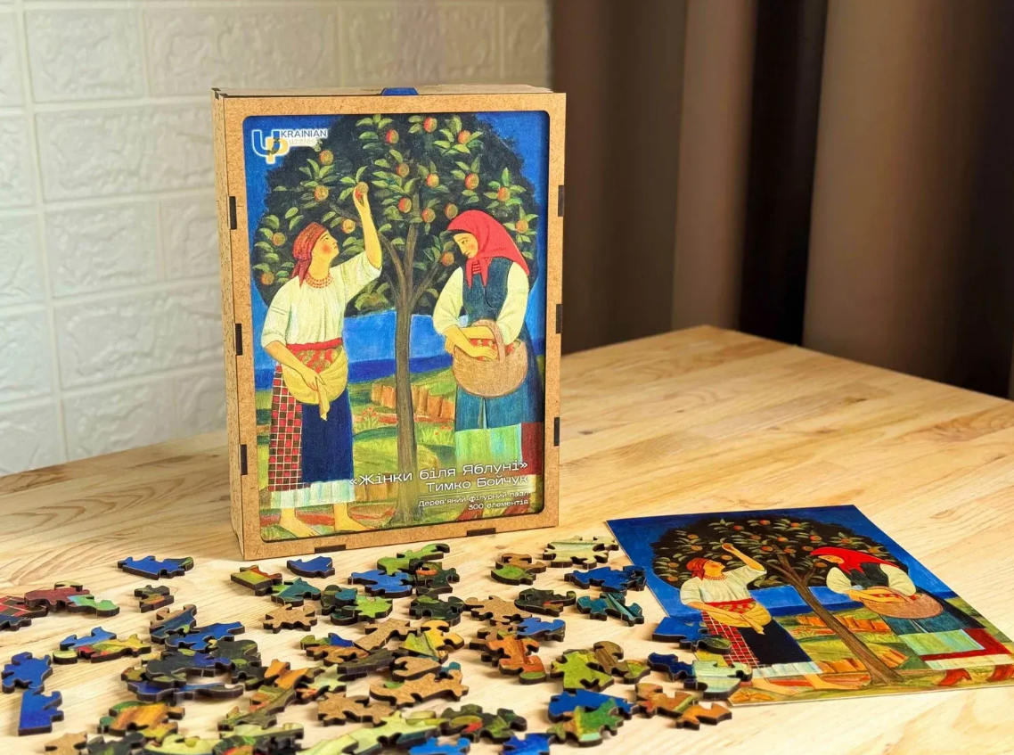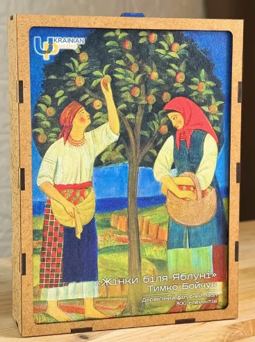 Картину “Біля яблуні” (1919-1920) називають іконою українського модернізму, в якій поєднано релігійне і національне, міфотворче і побутове, елементи візантійського, класичного та сучасного живопису. Це одна з небагатьох уцілілих картин Тимка Бойчука. Художник помер від туберкульозу у віці 25 років, а більшість його робіт зникли в час совєтської розправи над бойчукізмом у 30-х роках, коли Михайла Бойчука та інших бойчукістів розстріляли, а майже всю їхню мистецьку спадщину знищили. Тепер картина “Біля яблуні” зберігається в Національному художньому музеї України. Мистецтвознавці досі розходяться в інтерпретації сенсів, закладених у картині. Спробувати знайти відповідь можете і Ви, складаючи цей пазл.
