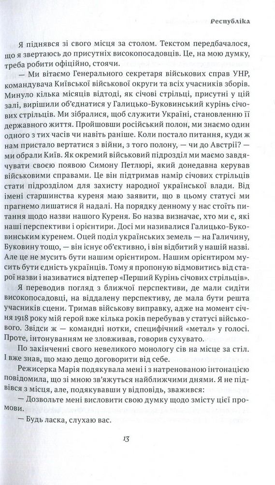 Чи можна змінити історію? Як це можливо? Достатньо звернутись до тих поворотних моментів, які у 1918 році спричинили вибір майбутнього країни. Авторка втілює грандіозний задум, переграючи хід подій Української революції. Слід у слід шляхом діячів революції прямують герої книги, аж нарешті відчувають себе достеменно у їхній шкурі. І лише тою мірою виявляються здатними змінювати історію, якою мірою виявляють здатність змінювати себе. Крізь лабіринти проекцій та віддзеркалень 1918 та 2018 років, авторка досліджує історичну пам'ять, виявляє загадки мотивів, намірів і вчинків тих, кого вважають героями, а так само й тих, кого вважають антигероями канонізованої історії. Перетин уявної кінореальності й живої дійсності спричиняє непередбачуваний перехід подій на той рівень творення, де ламаються сценарії минулого, теперішнього і майбутнього, де вони зливаються в єдиний потік...