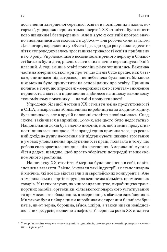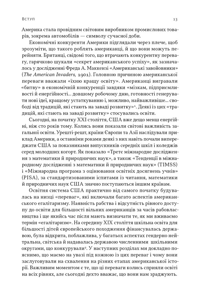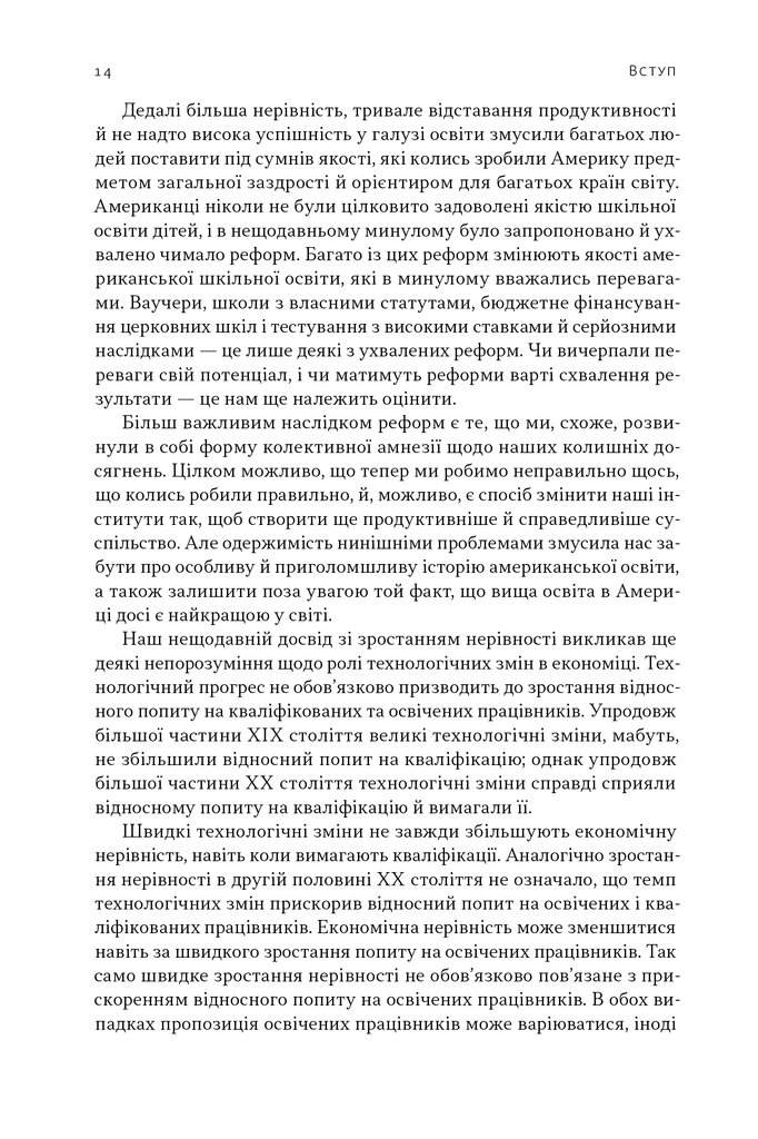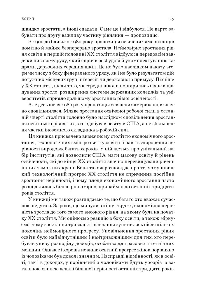 Одне з найважливіших питань нашого часу — як суспільство може використати освіту та технології, щоб забезпечити стійке економічне зростання і знизити нерівність. Ця фундаментальна праця проводить нас унікальною історією освіти в США і висвітлює її тісний зв’язок з економічним розвитком, доходячи висновків, які є актуальними не лише для Сполучених Штатів, а й для України та інших країн, що прагнуть побудувати стійкі економіки в умовах швидких технологічних змін. Тут представлено розгорнуту наукову та статистичну аргументацію на користь головного висновку, що саме американська система освіти та її глобальне лідерство обумовили становлення США найпотужнішою країною світу. Це дало змогу запропонувати шлях розв’язання сучасних проблем економічного зростання, подолання бідності, зменшення нерівності в доходах та соціальної нерівності, який передбачає акселерацію інвестицій у людський капітал і розвиток масової освіти всіх рівнів.