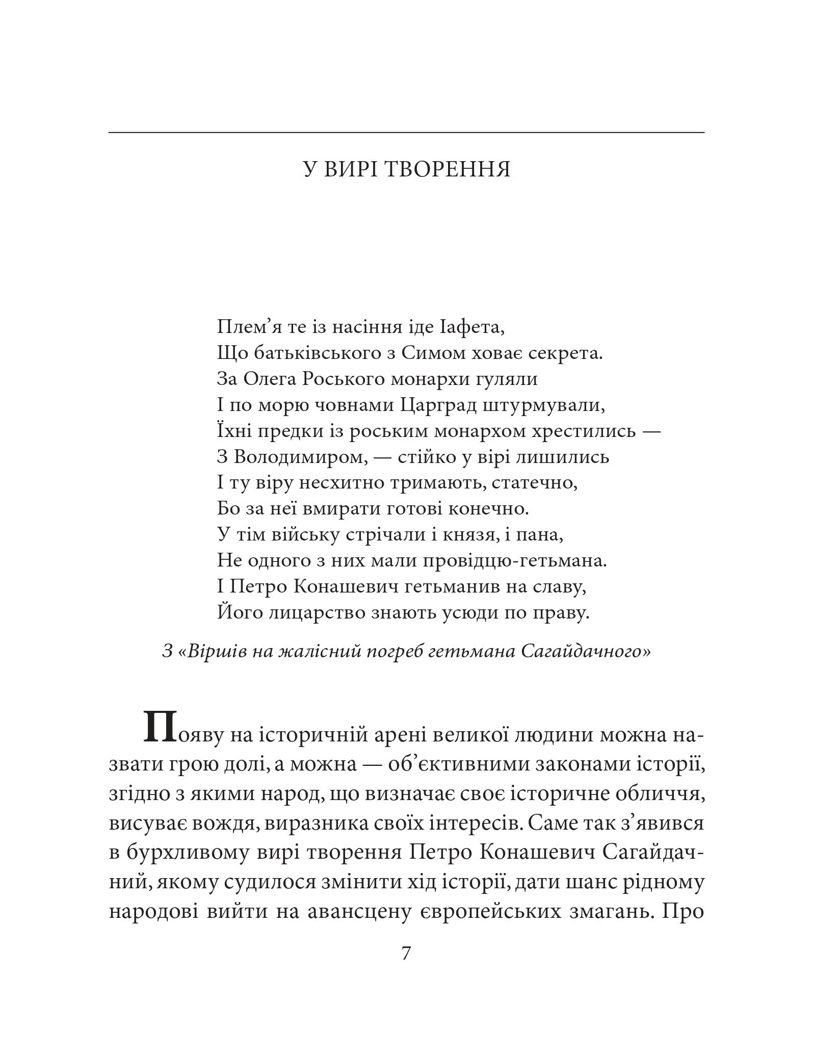 Петро Конашевич Сагайдачний (1570—1622) увійшов в історію як один з найвизначніших козацьких гетьманів Війська Запорозького, видатний полководець, державний діяч, дипломат, захисник української культури і духовності. Завдяки його діяльності козацьке військо перетворилося на регулярне військове формування. Перемоги Сагайдачного в походах до Криму і Туреччини сприяли зростанню міжнародного значення українського козацтва. Визначну роль відігравав гетьман і в Хотинській війні 1620—1621 років. Під час Хотинської битви Сагайдачний очолював 40-тисячне козацьке військо. Перемога в ній зупинила наступ Османської імперії на Європу. І в цьому неперевершена заслуга Петра Конашевича Сагайдачного — звитяжного лицаря, котрий завжди був «готовий отчизні служити, за вольность її і свій живот положити».