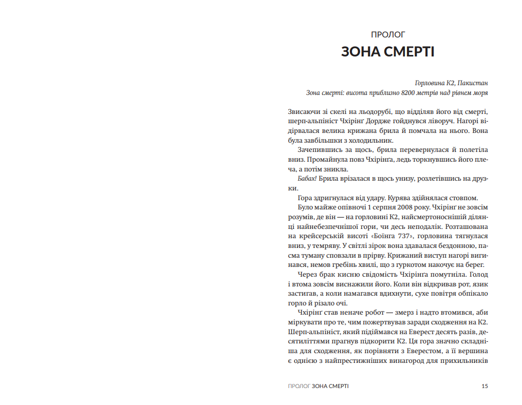 1-го серпня 2008 року під час сходження на К2 загинули одинадцятеро людей. Двоє шерпів — Чірінґ Дордже та Пасанґ Лама — зуміли вижити. На основі ретельного дослідження і численних інтерв’ю Пітер Цукерман й Аманда Падоан уперше розповідають їхню дивовижну історію. Автори простежують життєвий шлях шерпів від рідних сіл високо в Гімалаях, через нетрі Катманду і льодовики Пакистану, до базового табору на схилі найнебезпечнішої вершини світу. Того жахливого дня на К2 Чірінґ знаходить Пасанґа, залишеного напризволяще на крижаному карнизі в зоні смерті… Те, що трапилося далі, стало легендою серед альпіністів.
